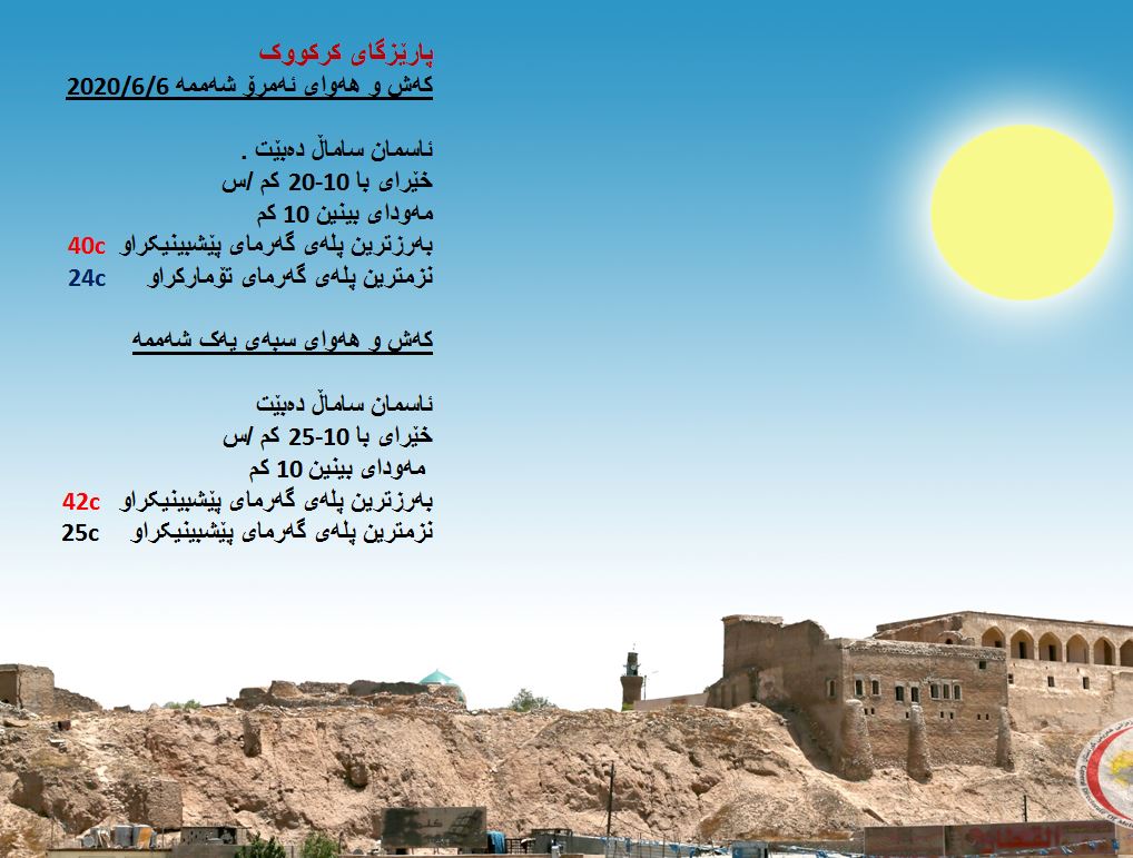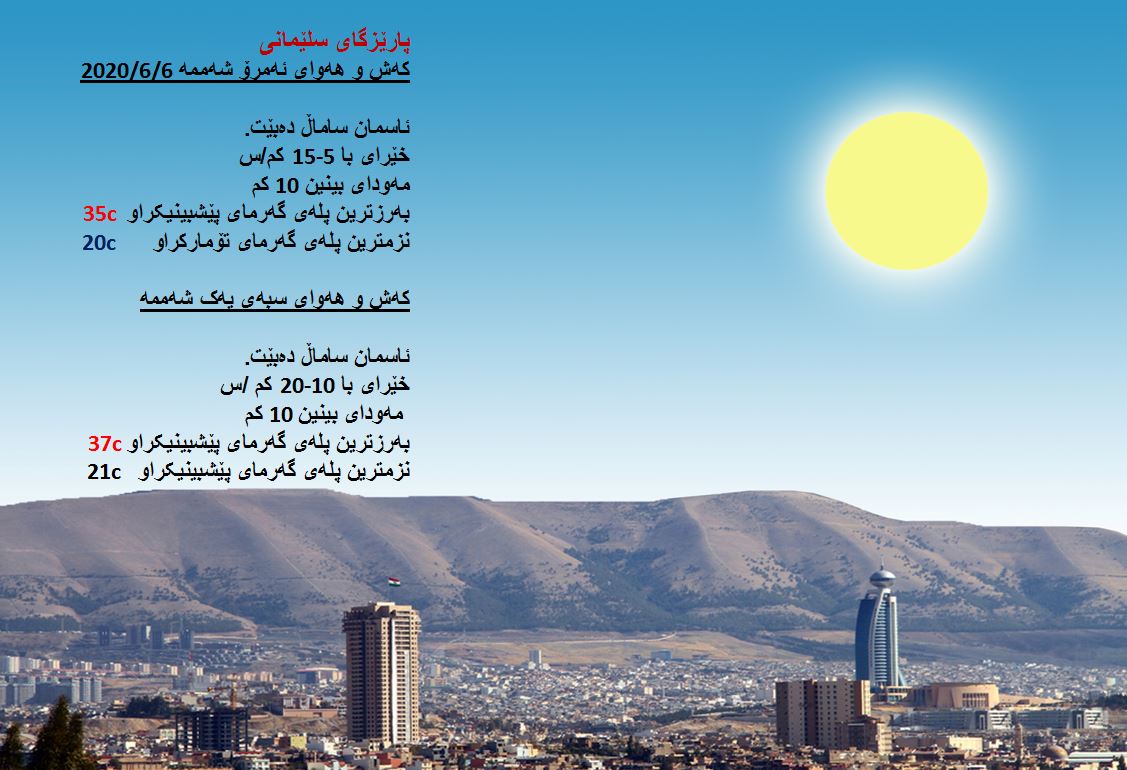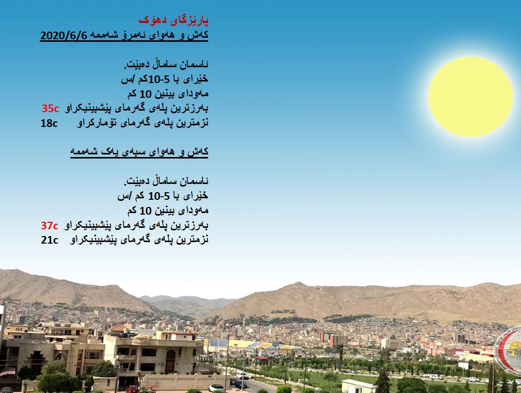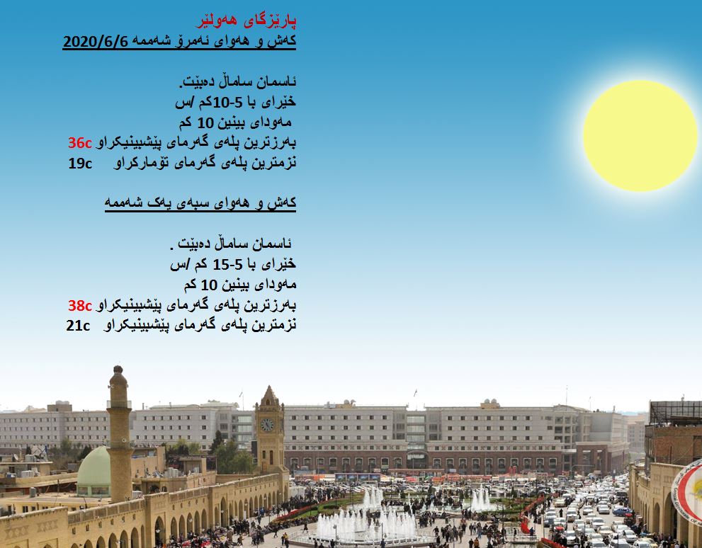 بەڕێوەبەرایەتی كەشناسی و بومەلەرزەزانی ھەرێمی كوردستان، پێشبینیەكانی بۆ كەشوھەوای 48 كاتژمێری داھاتوو راگەیاند، بەگوێرەی پێشبینیەكان ئەمڕۆ ئاسمانی ھەرێمی كوردستان ساماڵ دەبێت. بەرزترین پلەی گەرما لە ھەولێر 36 و سلێمانی و دھۆك 35 لە كەركووك بەرزترین پلەی گەرما 40 پلەی سیلیزی دەبێت.