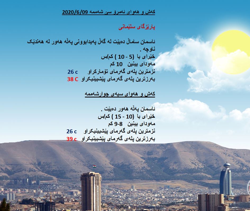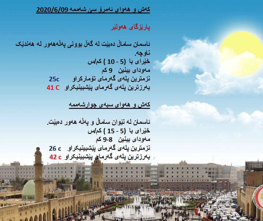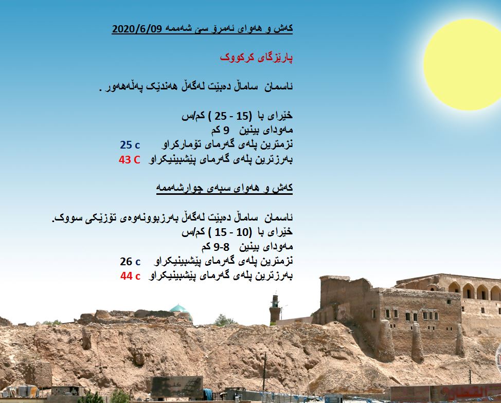 لەبارەی كەشوھەوای سبەی كەشناسی پێشبینی دەكات، رۆژی چوارشەممە ئاسمانی ھەرێمی كوردستان لەنێاوان ساماڵ و پەڵە ھەوردا دەبێت و پلەی گەرما زیاتر بەرزدەبێتەوە لە سنووری پارێزگای كەركووك لە 45 پلە بەرزدەبێتەوە.