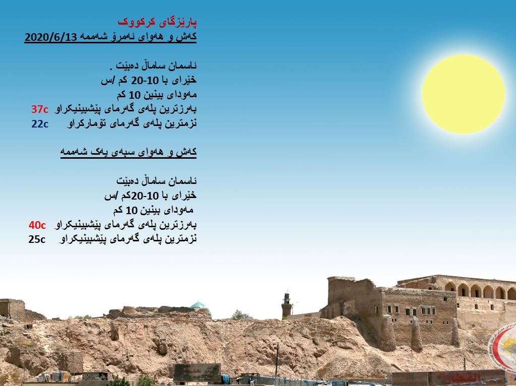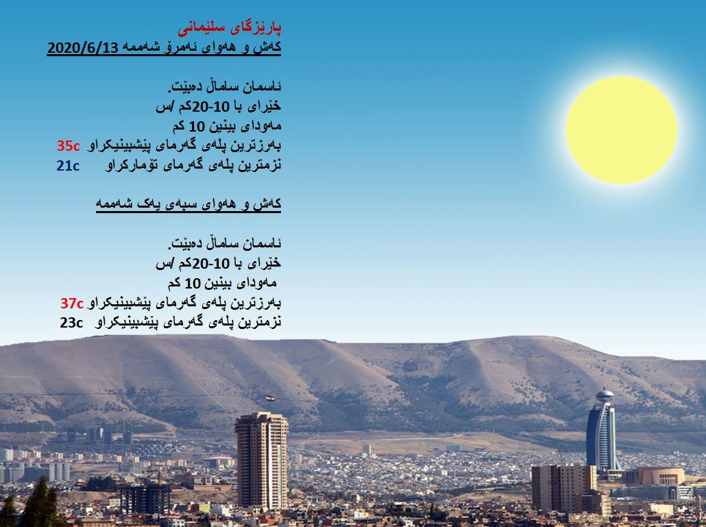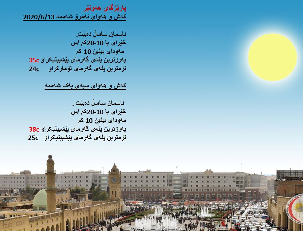 بەڕێوەبەرایەتی كەشناسی و بومەلەرزەزانی ھەرێمی كوردستان، پێشبینیەكانی بۆ كەشوھەوای 48 كاتژمێری داھاتوو راگەیاند، بەگوێرەی پێشبینیەكان ئەمڕۆ ئاسمانی ھەرێمی كوردستان ساماڵ دەبێت. بەرزترین پلەی گەرما لە ھەولێر و سلێمانی 35 و دھۆك 34 لە كەركووك بەرزترین پلەی گەرما 37 پلەی سیلیزی دەبێت.