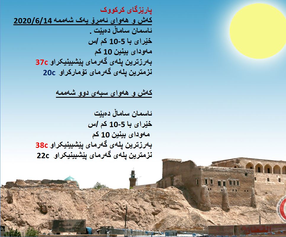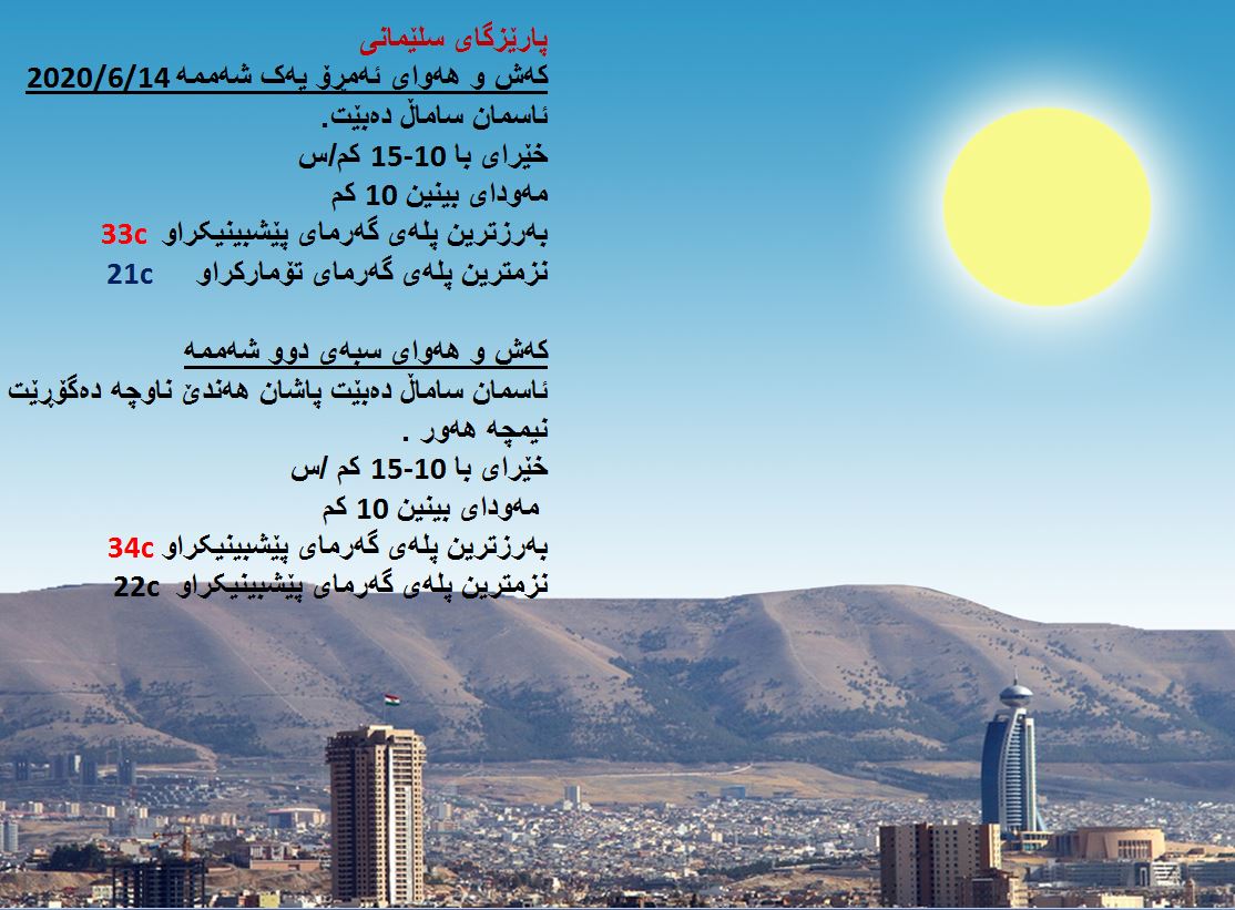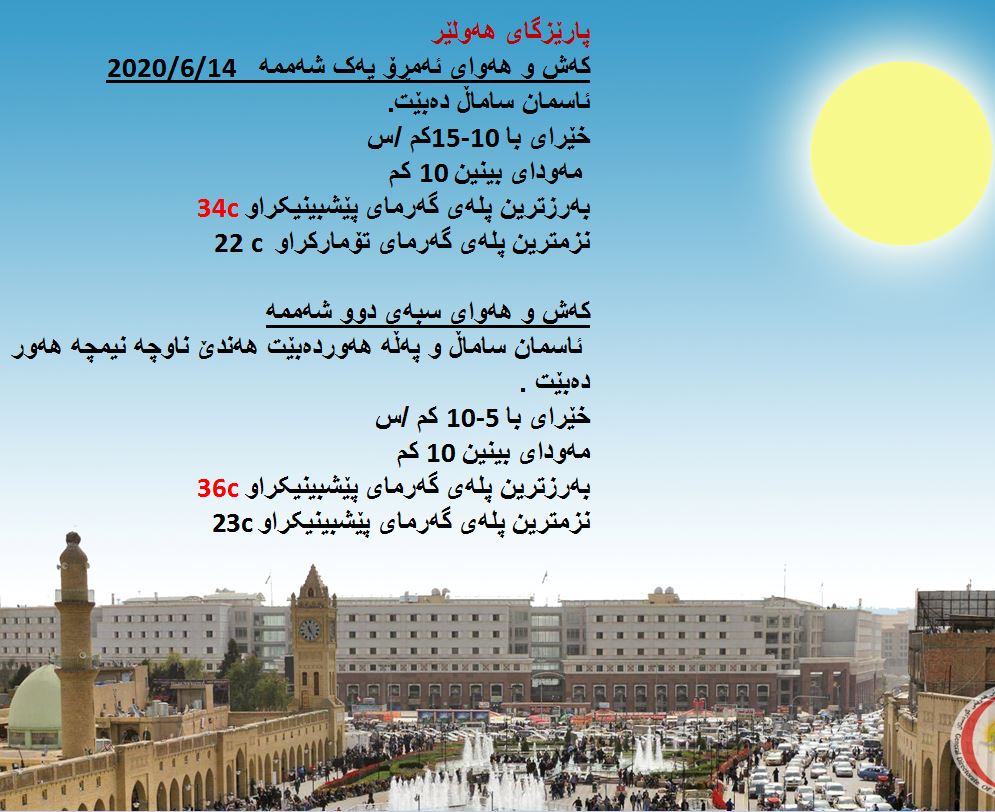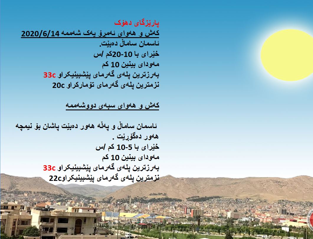 بەڕێوەبەرایەتی كەشناسی و بومەلەرزەزانی ھەرێمی كوردستان، پێشبینیەكانی بۆ كەشوھەوای 48 كاتژمێری داھاتوو راگەیاند، بەگوێرەی پێشبینیەكان ئەمڕۆ ئاسمانی ھەرێمی كوردستان ساماڵ دەبێت. بەرزترین پلەی گەرما لە ھەولێر 34 و سلێمانی و دھۆك 33 لە كەركووك بەرزترین پلەی گەرما 37 پلەی سیلیزی دەبێت.