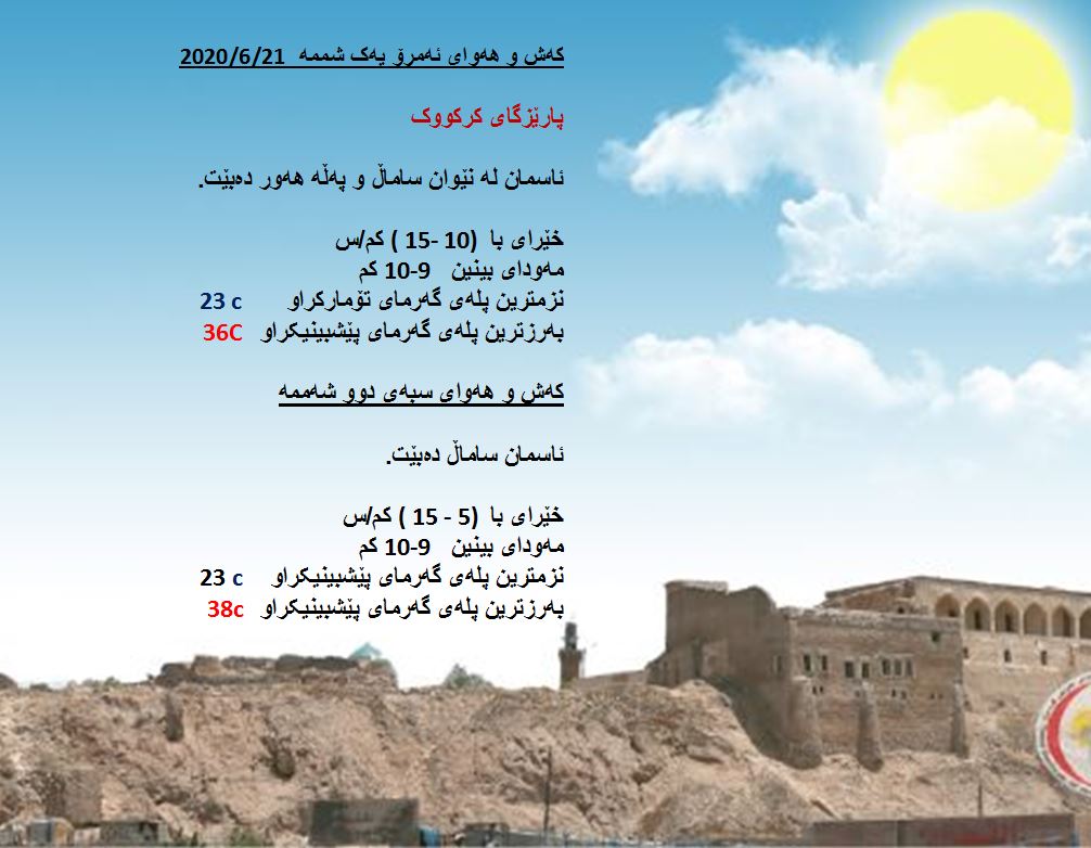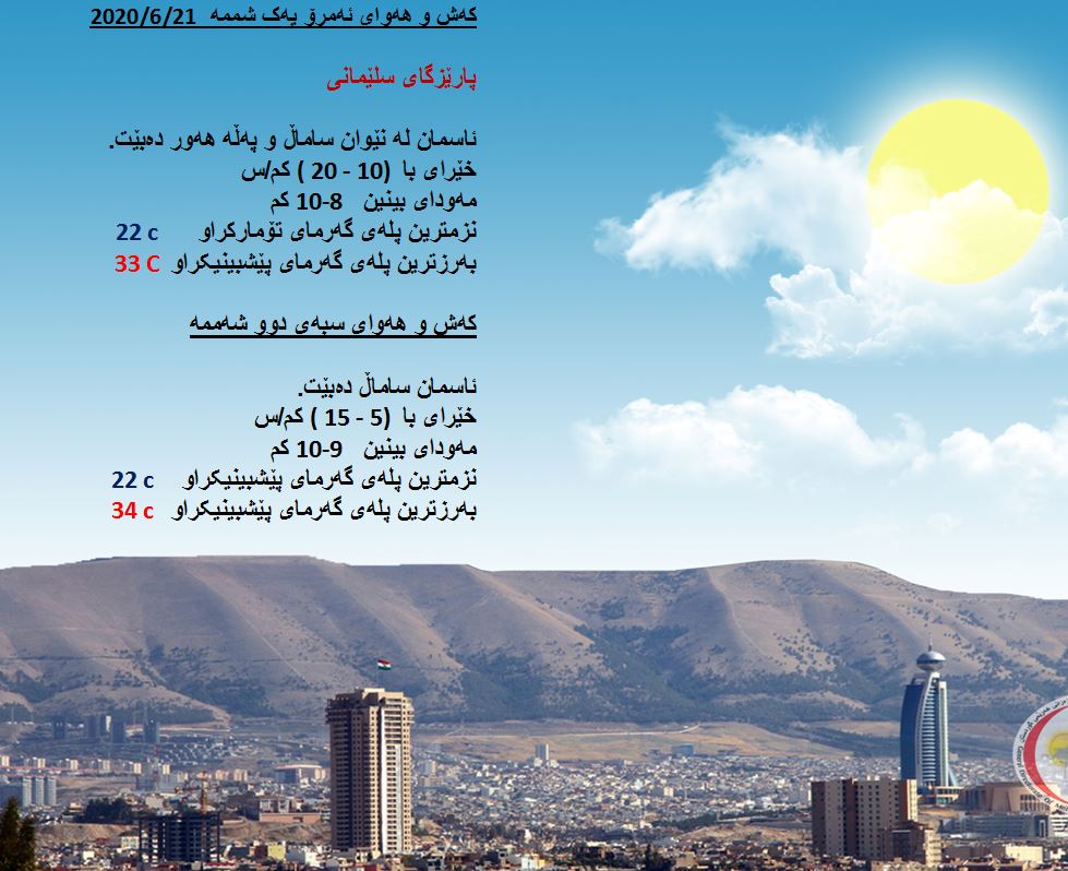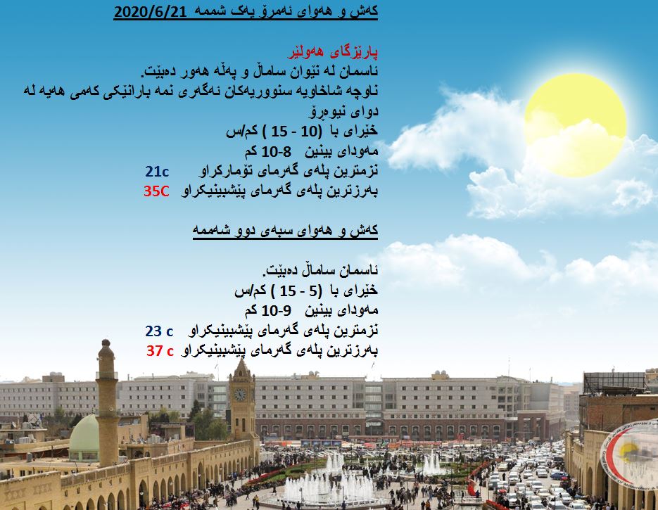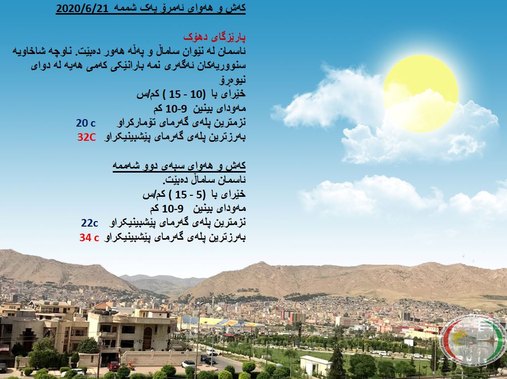 بەڕێوەبەرایەتی كەشناسی و بومەلەرزەزانی ھەرێمی كوردستان، پێشبینیەكانی بۆ كەشوھەوای 48 كاتژمێری داھاتوو راگەیاند، بەگوێرەی پێشبینیەكان ئەمڕۆ ئاسمانی ھەرێمی كوردستان لەنێوان ساماڵ و پەڵە ھەور دەبێت. بەرزترین پلەی گەرما لە ھەولێر 35 و سلێمانی 33 و دھۆك 32 لە كەركووك بەرزترین پلەی گەرما 36 پلەی سیلیزی دەبێت.