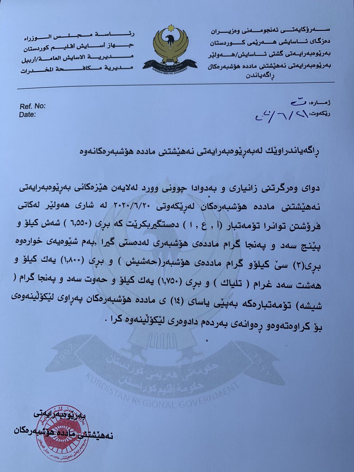 له‌ راگه‌یه‌ندراوه‌كه‌دا هاتووه‌، "دوای وه‌رگرتنی زانیاری و به‌دواداچوونی ورد له‌لایه‌ن هێزه‌كانی به‌ڕێوه‌به‌رایه‌تی نه‌هێشتنی مادده‌ی هۆشبه‌ره‌كان له‌ رێكه‌وتی 20/6/2020 له‌ شاری هه‌ولێر، له‌كاتی فرۆشتن توانرا تۆمه‌تبارێك به‌ناوی "أ،ع،ا" ده‌ستگیر بكرێت، كه‌ بڕیی 6 كیلۆ و 550 گرام مادده‌ی هۆشبه‌ری له‌ده‌ست گیرا".