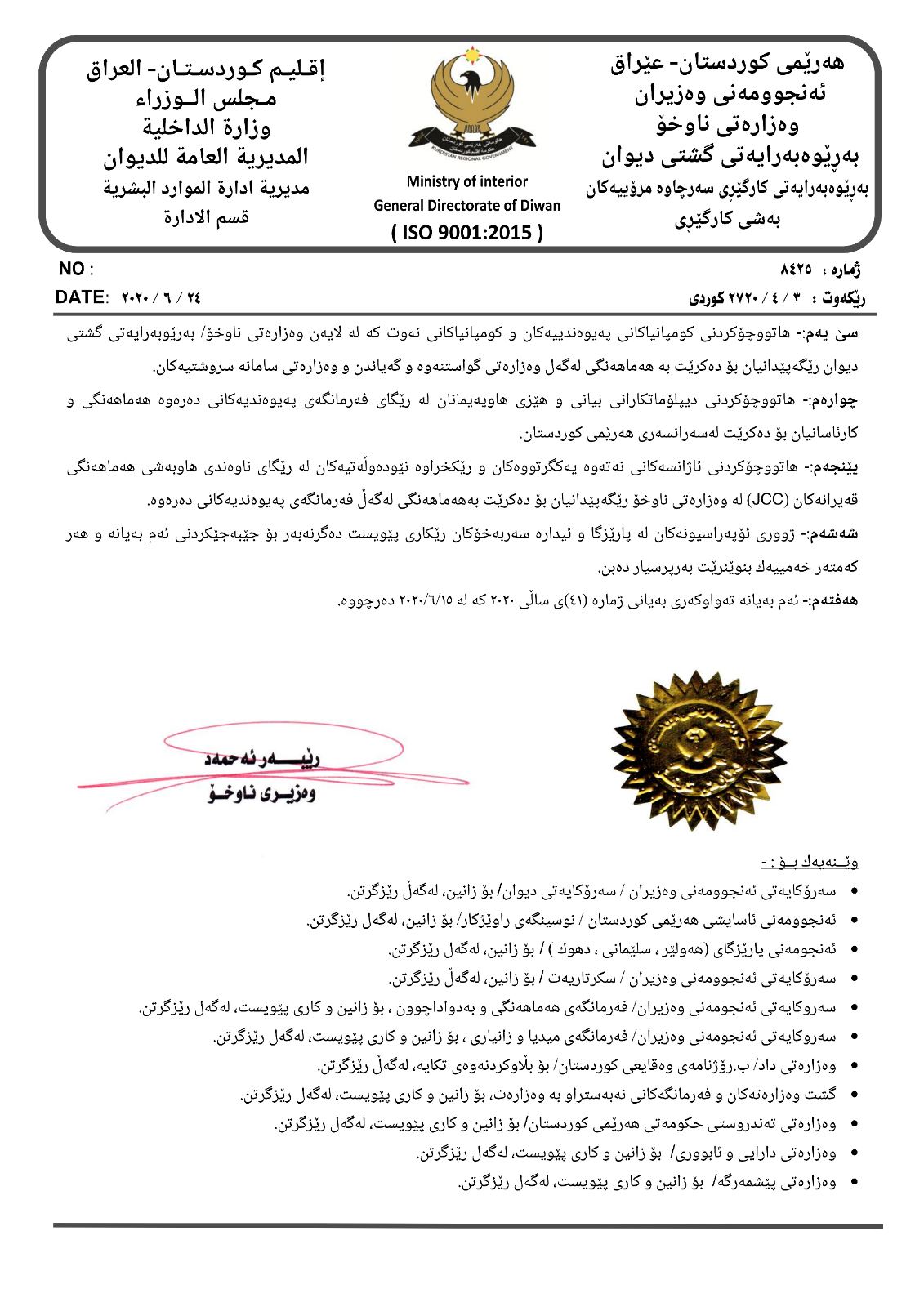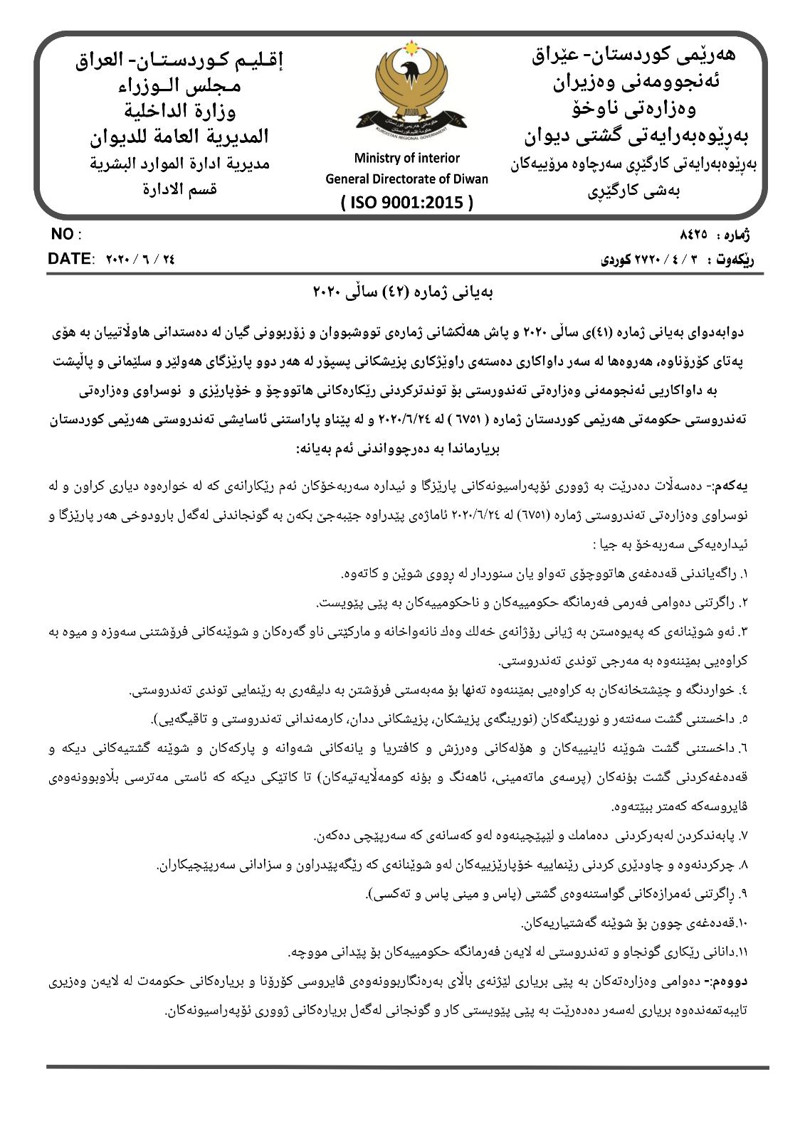 حه‌وته‌م: ئه‌م به‌یانه‌ ته‌واوكه‌ری به‌یانی ژماره‌ "41"ی ساڵی 2020ـه‌، كه‌ له‌ 15/6/2020ـه‌وه‌ ده‌رچووه‌.