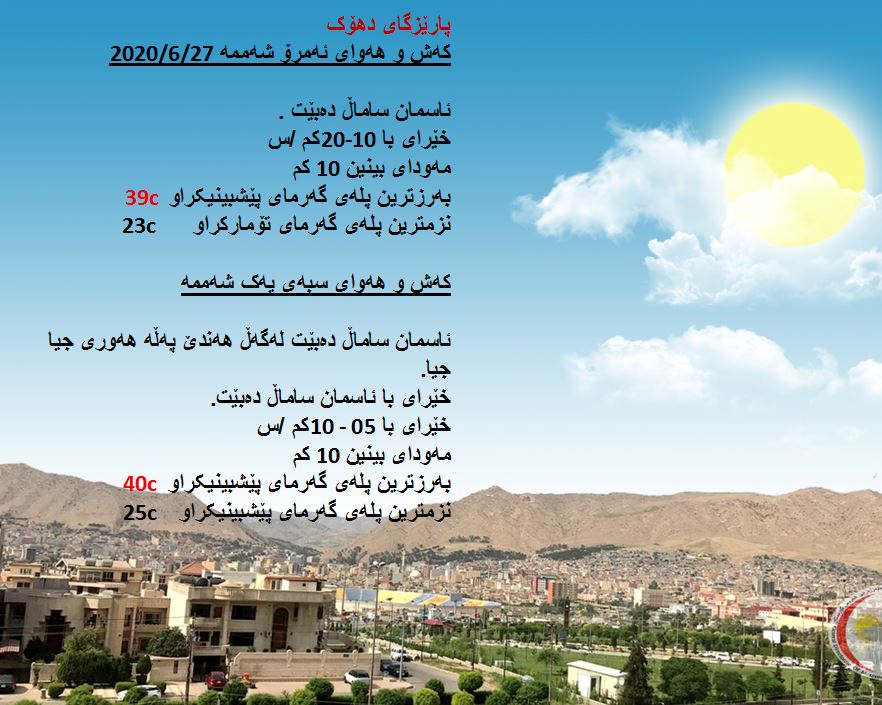 لەبارەی كەشوھەوای سبەی كەشناسی پێشبینی دەكات، رۆژی دووشەممە ئاسمانی ھەرێمی كوردستان ساماڵ دەبێت و لە ھەندێك ناوچە پلەی گەرما زیاتر بەرزدەبێتەوە.