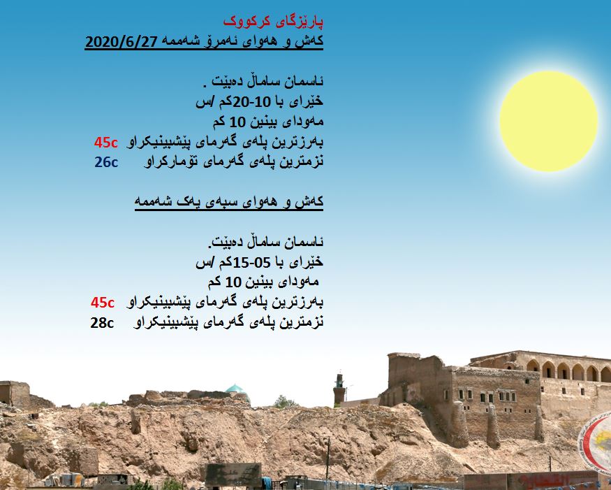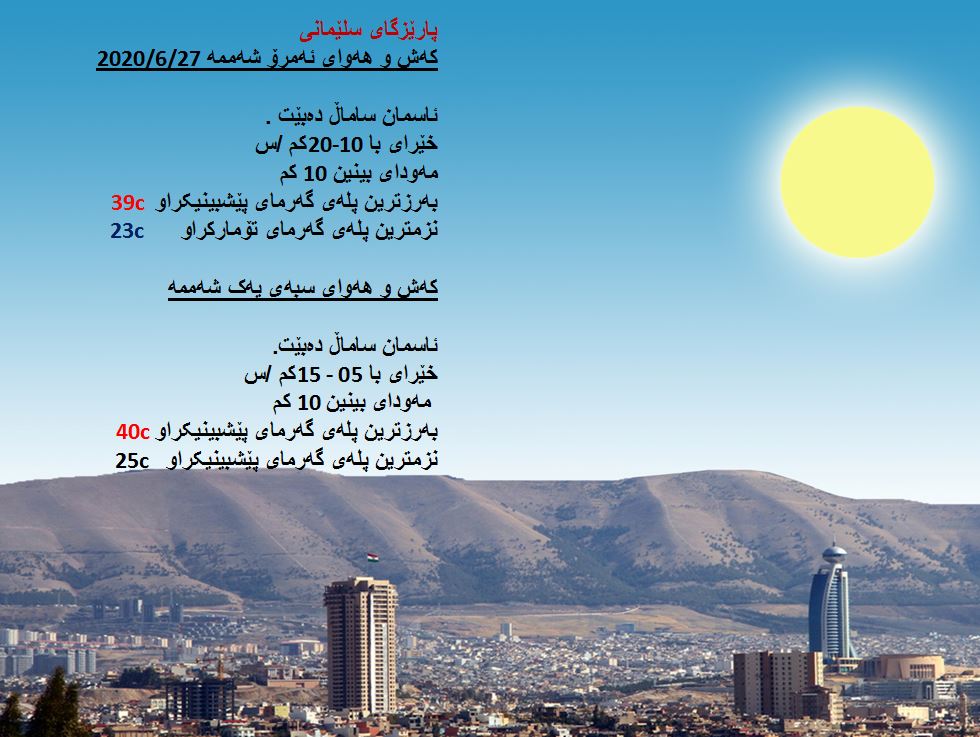 بەڕێوەبەرایەتی كەشناسی و بومەلەرزەزانی ھەرێمی كوردستان، پێشبینیەكانی بۆ كەشوھەوای 48 كاتژمێری داھاتوو راگەیاند، بەگوێرەی پێشبینیەكان ئەمڕۆ ئاسمانی ھەرێمی كوردستان ساماڵ دەبێت. بەرزترین پلەی گەرما لە ھەولێر 42 و سلێمانی و دھۆك 39 لە كەركووك بەرزترین پلەی گەرما 45 پلەی سیلیزی دەبێت.