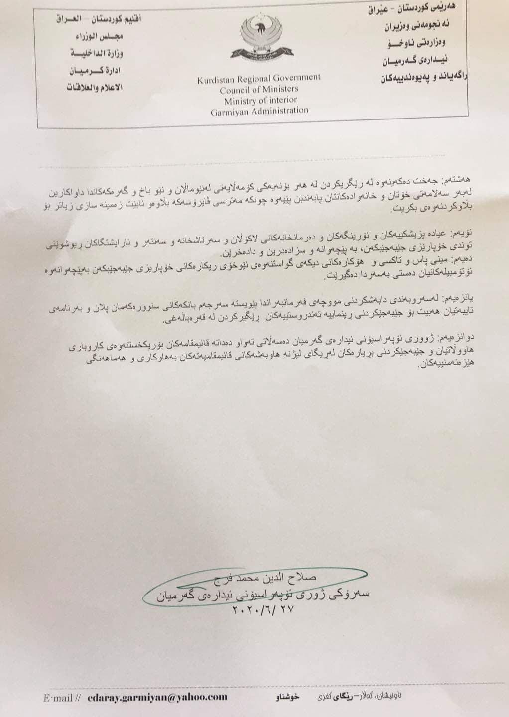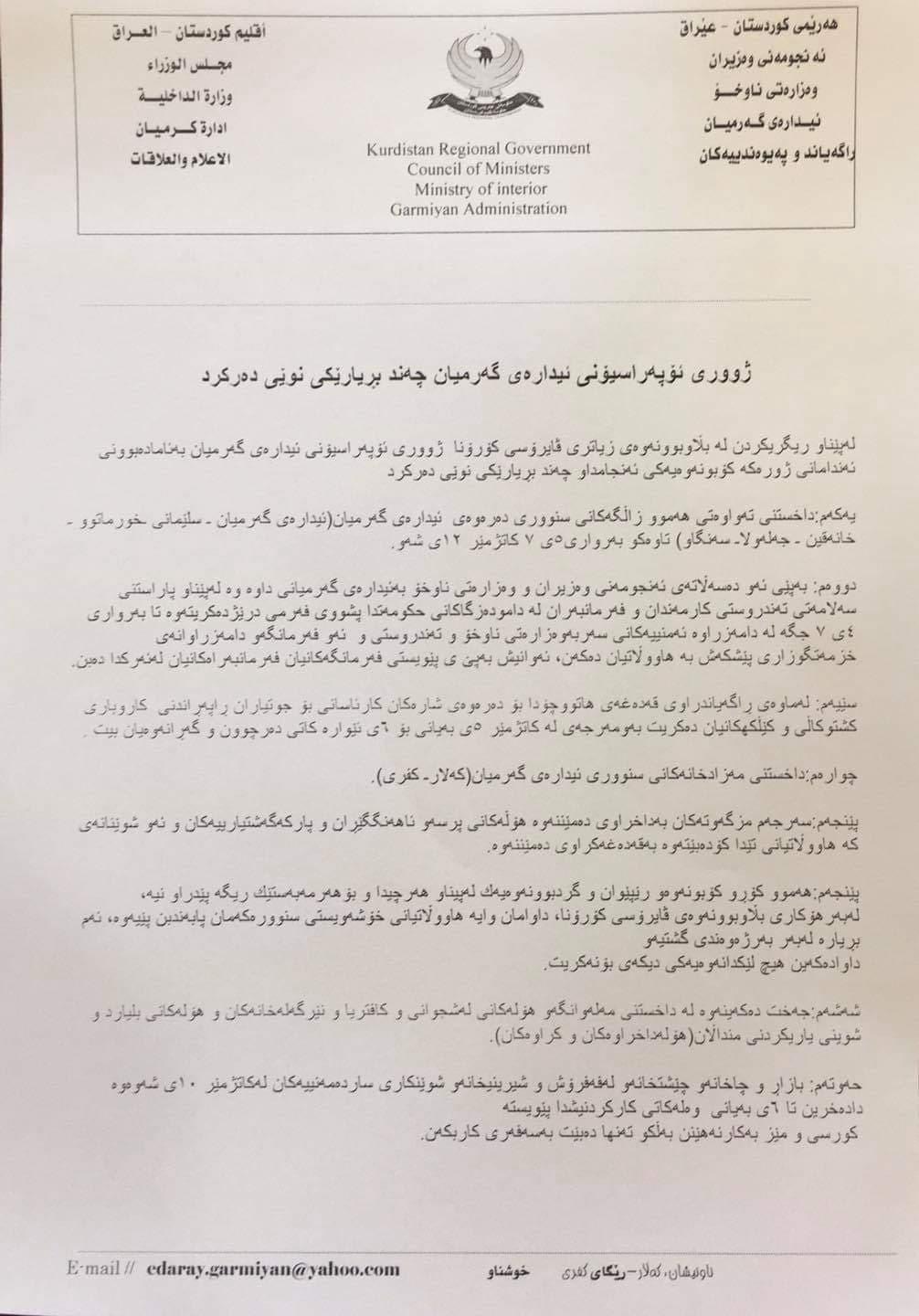 ئیدارەی گەرمیان بڕیاریداوە، سەرجەم بازگەکانی دەرەوەی ئیدارەکە بە داخراوی تا 5-7-2020 بمێننەوە.