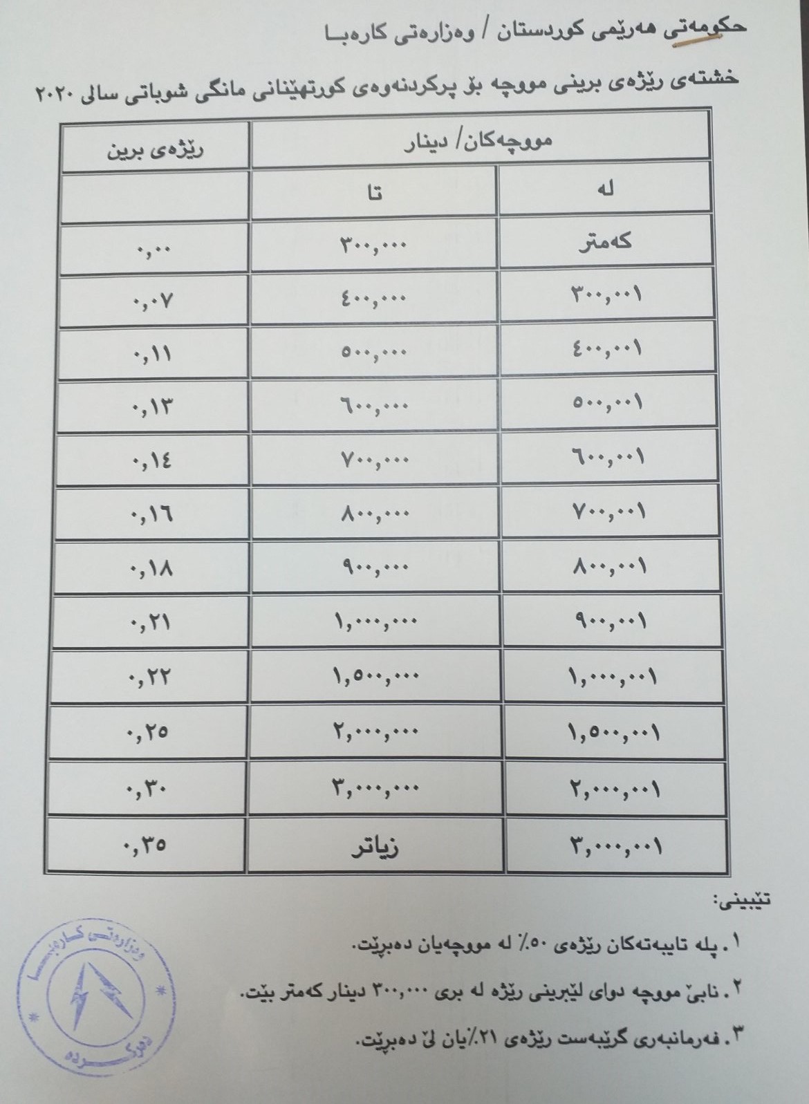 وەزارەتی کارەبا بۆ پڕکردنەوەی کورتهێنان لە دابینکردنی مووچەی فەرمانبەران، کە ئەنجوومەنی وەزیران بڕیاری لەسەرداوە، خشتەیەکی بڵاوکردەوە.