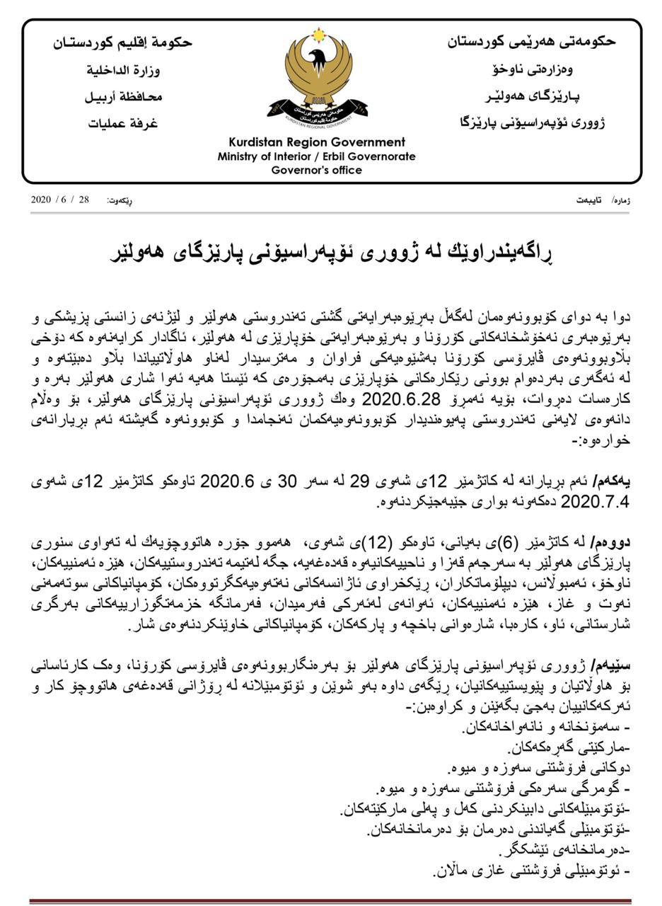 هاوڵاتییانی سنووری پارێزگای هەولێر، ئاگادار دەکەینەوە کە بڕیارەکانی ژووری ئۆپەراسیۆن لە بارەی قەدەغەی هاتووچۆ لە سنووری پارێزێگای هەولێر، لە کاتژمێر 6ی بەیانی ڕۆژی سێ شەممە 2020.6.30، تاوەکو کاتژمێر 12ی شەوی 2020.7.4، دەچێتە بواری جێ بەجێ کردنەوە.
