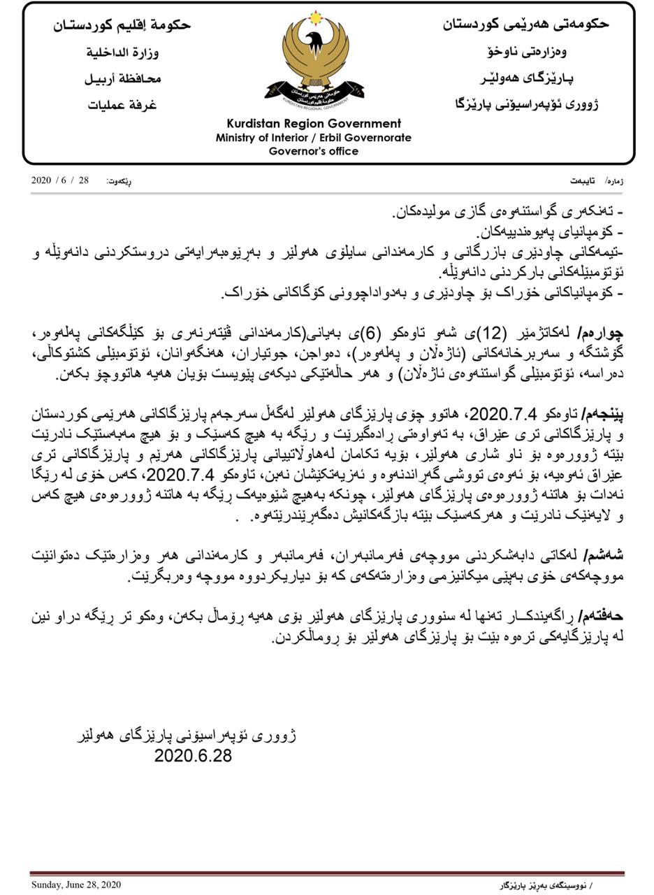 پێنجهم: تا 4ی تهمموز ههموو هاتووچۆیهك له نێوان ههولێر و پارێزگاكان نابێت. كهس خۆی له رێگه نهدات.
