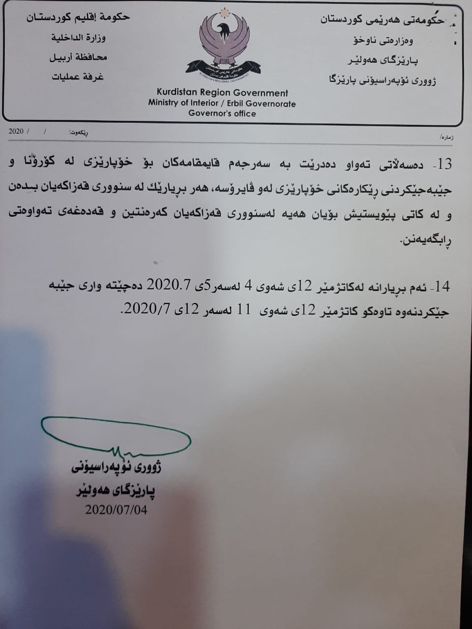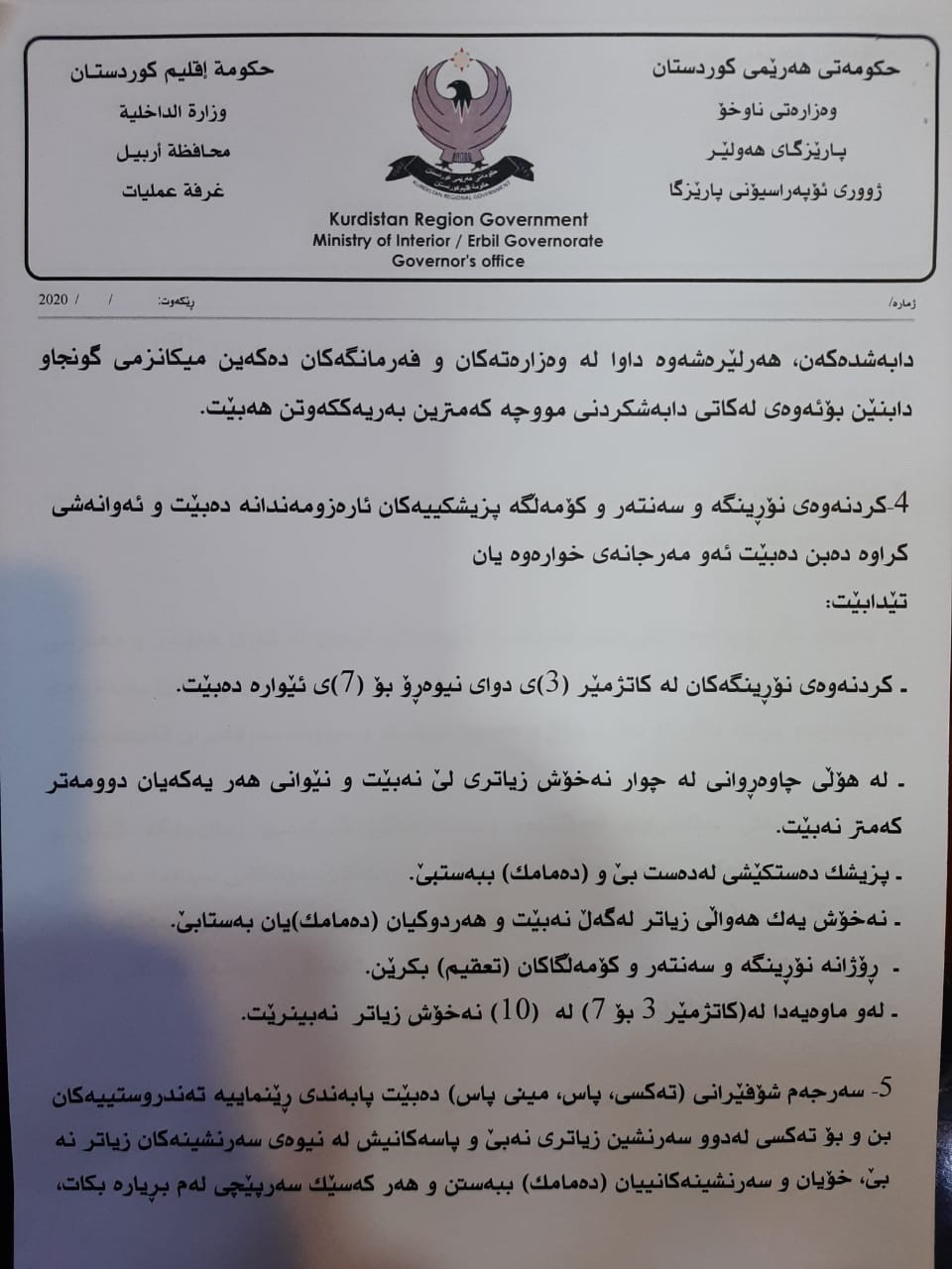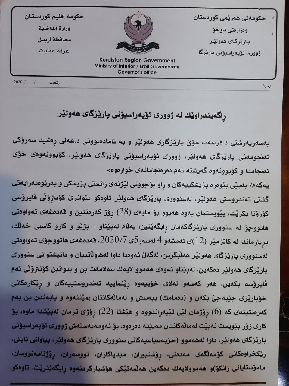پارێزگاری ههولێر بڕیار و رێكاره نوێیهكانی راگهیاند