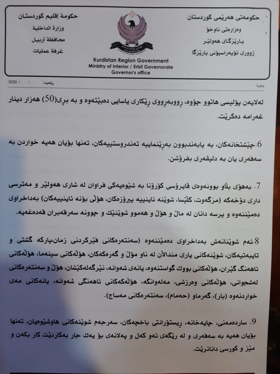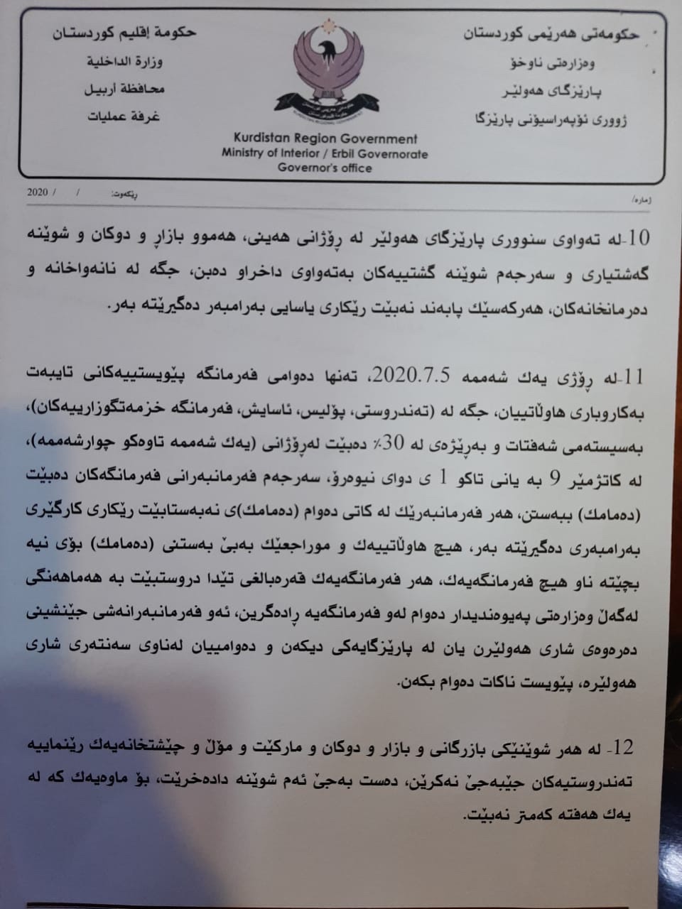 دواتریش له راگهیهندراوێكدا ژووری ئۆپهراسیۆنی پارێزگای ههولێر تهواوی بڕیار و رێنماییه نوێیهكانی خسته روو و جهخت لهوه كراوهتهوه، قهدهغهی هاتووچۆی گشتی ههڵدهگیرێت، بهڵام رێكارهكان توندتر دهكرێن.