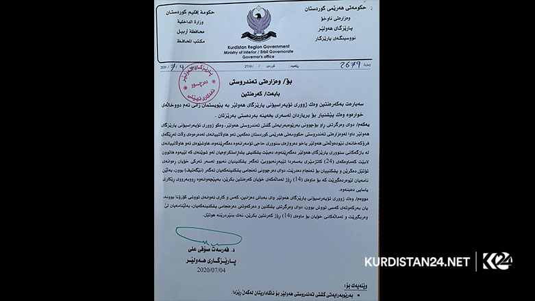 پارێزگاری ههولێر داواكاریهك لهبارهی كهرهنتینه ئاراستهی وهزارهتی تهندروستی دهكات