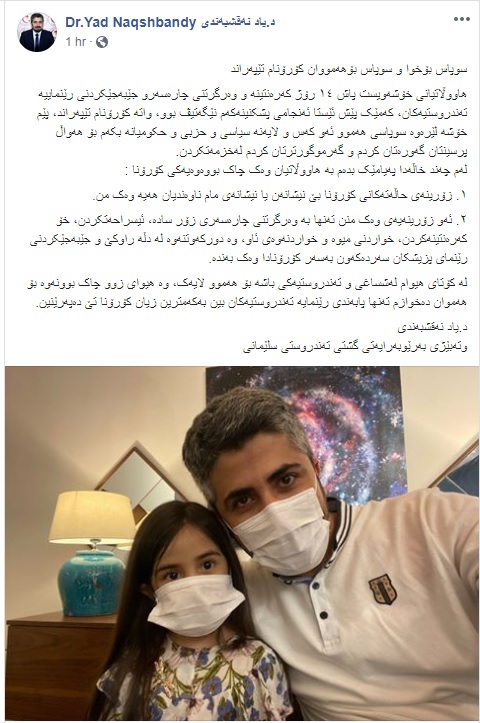 هه‌روه‌ها نووسسیویه‌تی: ده‌مه‌وێت وەك چاك بوویەکی کۆرۆنا لەم چەند خاڵەدا پەیامێك بدەم بە هاووڵاتیان: