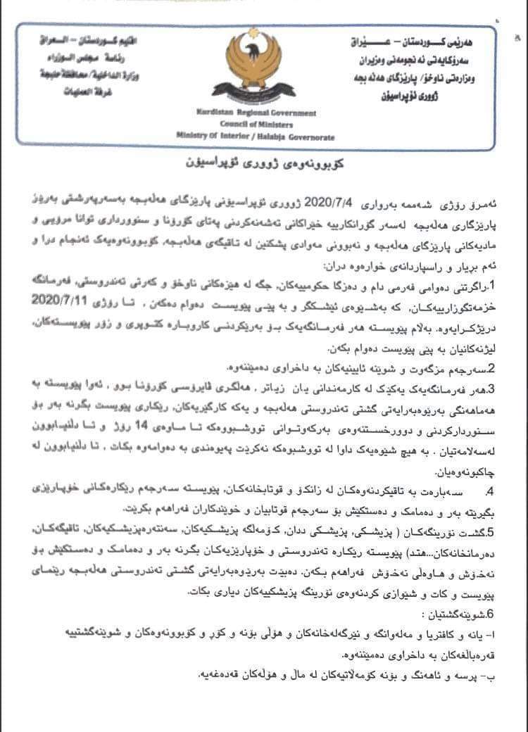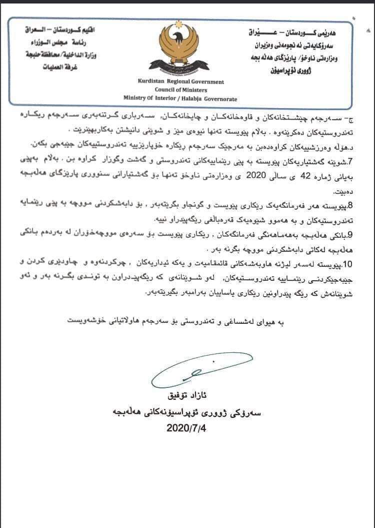 ههورهها دهبێت یانه، مهلهوانگه، كافتریا، نێرگهلهخانه و هۆڵی بۆنهكان و شوێنه گشتییهكان به داخراوی بمێننهوه و پرسه و ئاههنگ و بۆنه كۆمهڵایهتییهكان له ماڵ و هۆڵهكان قهدهغهیه.