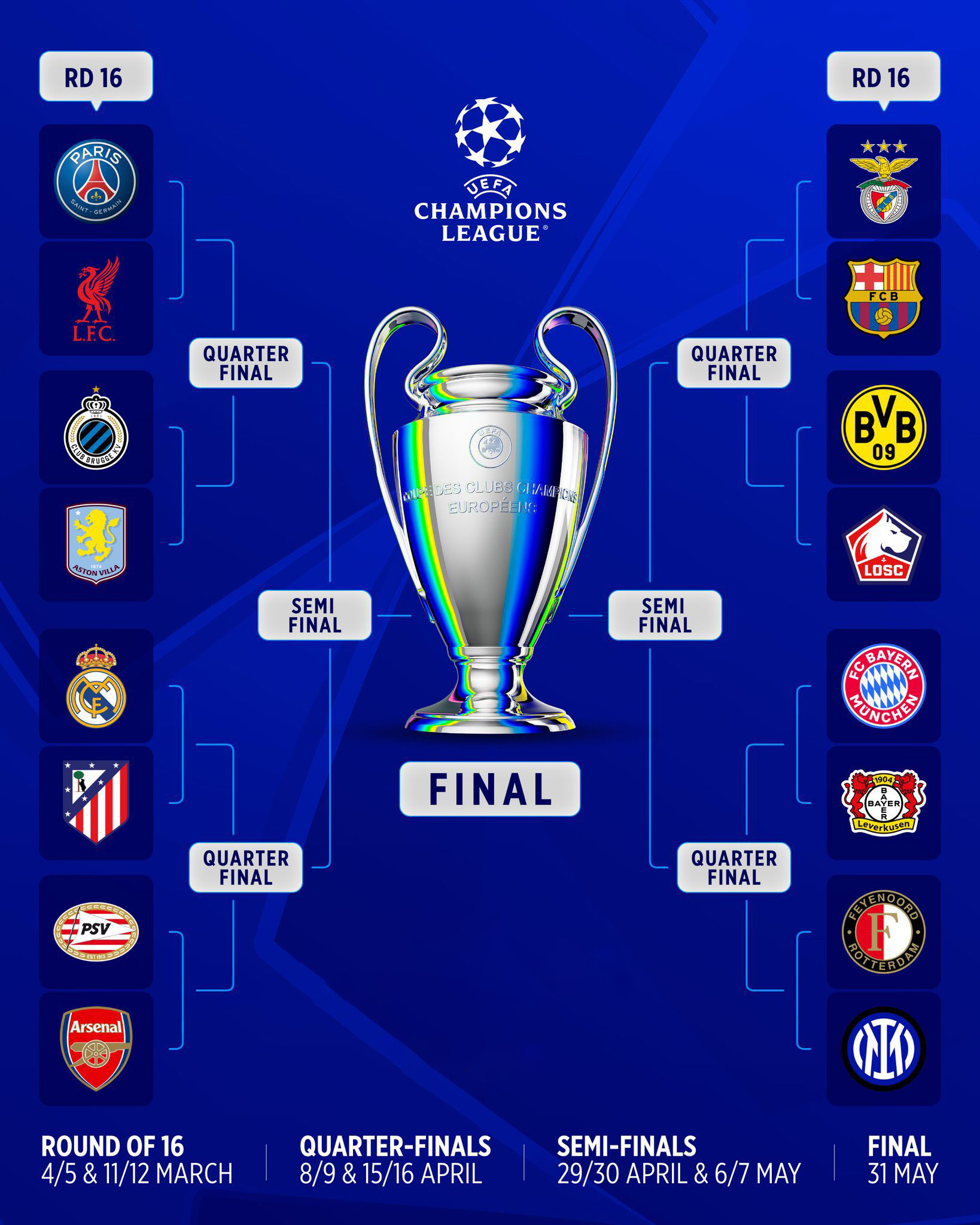 ریال مهدریدی پاڵهوانی پازده جاری چامپیۆنزلیگ و پاڵهوانی وهشانی رابردوو له یاریی لوتكهی قۆناخی شازده رووبهرووی ئاتڵێتیكۆ مهدریدی هاونیشتمانی دهبێتهوه و له دێربی مهدرید رووبهروو دهبنهوه، براوهی نێوانیشیان رووبهرووی براوهی یارییهكهی ئارسێناڵی ئینگلیزی و ئایندهۆڤینی هۆڵهندی دهبێتهوه.