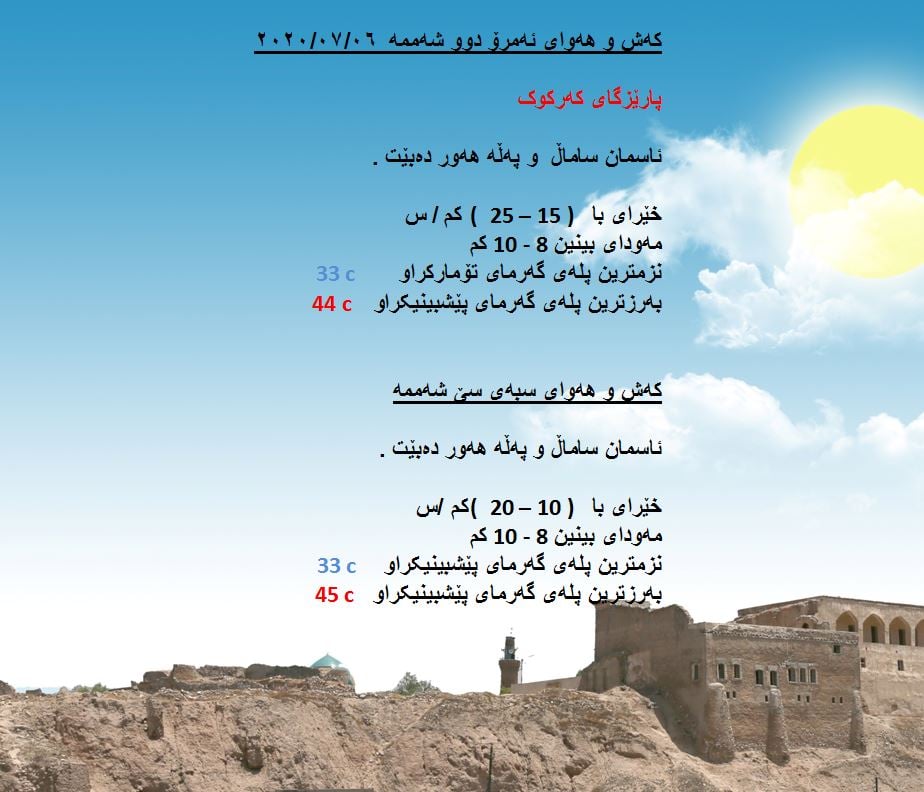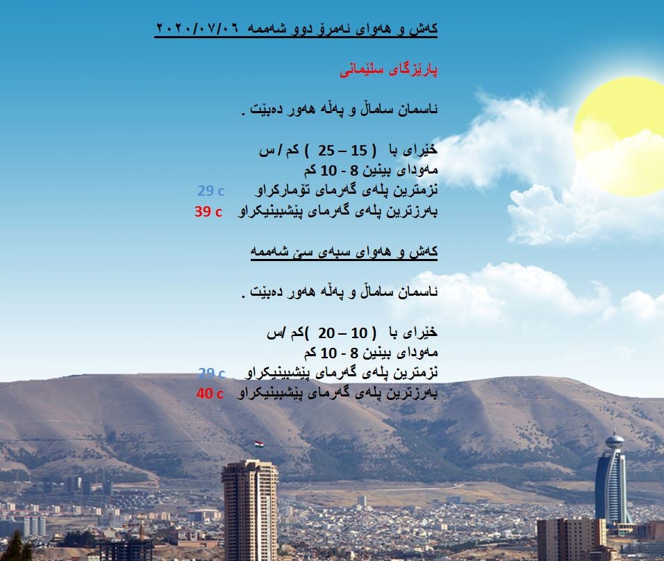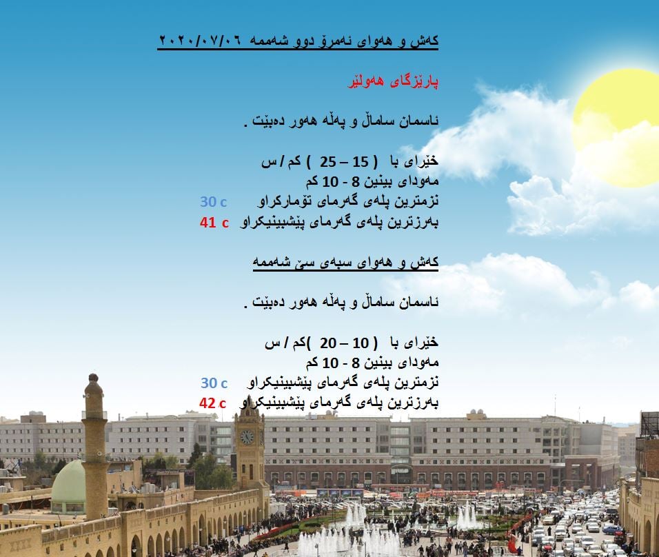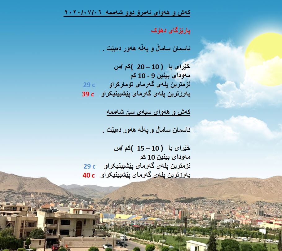 بەڕێوەبەرایەتی كەشناسی و بومەلەرزەزانی ھەرێمی كوردستان، پێشبینیەكانی بۆ كەشوھەوای 48 كاتژمێری داھاتوو راگەیاند، بەگوێرەی پێشبینیەكان ئەمڕۆ ئاسمانی ھەرێمی كوردستان لەنێوان ساماڵ و پەڵە ھەوردا دەبێت. بەرزترین پلەی گەرما لە ھەولێر 41 و سلێمانی و دھۆك 39 و لە كەركووك بەرزترین پلەی گەرما 44 پلەی سیلیزی دەبێت.
