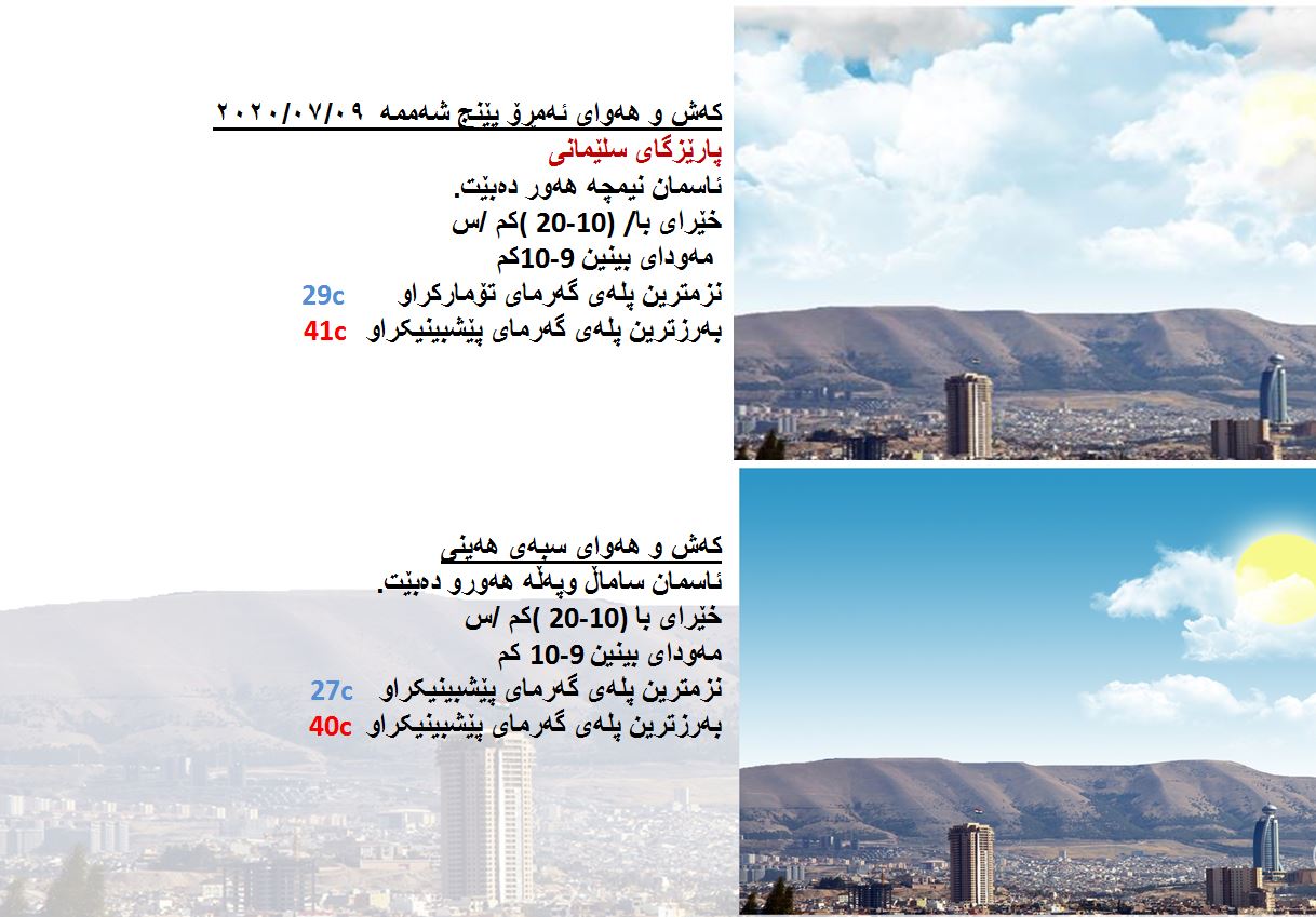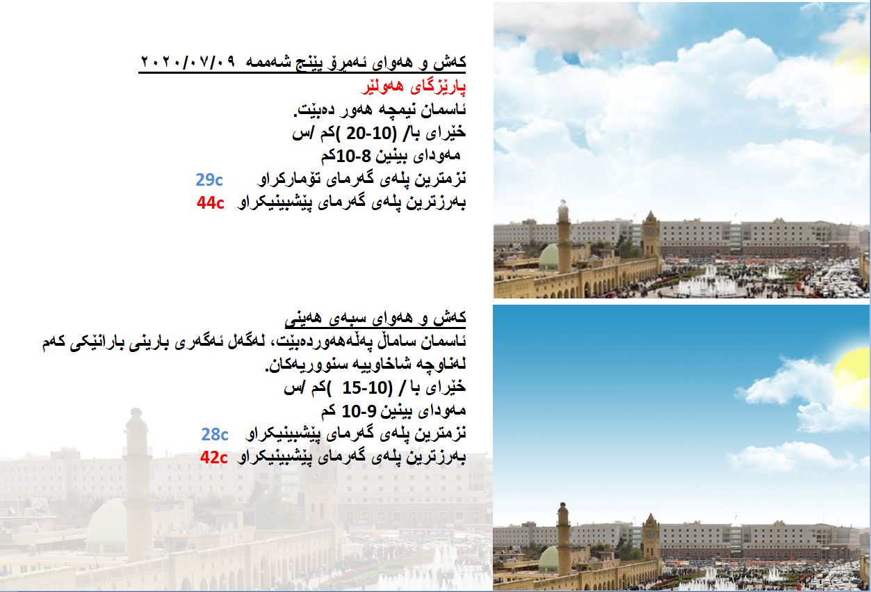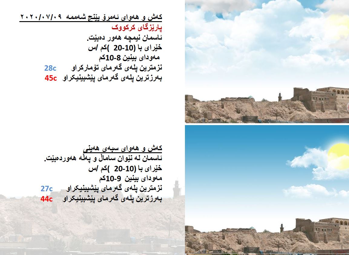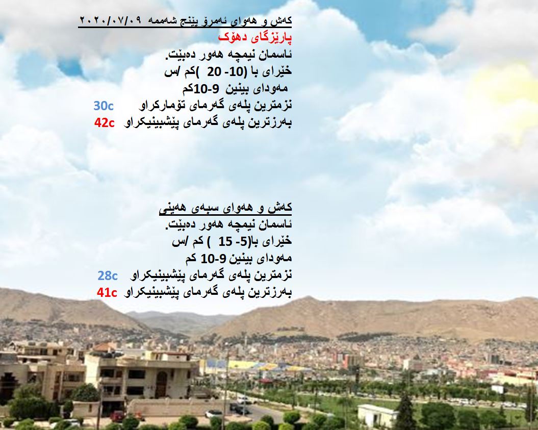 بەڕێوەبەرایەتی كەشناسی و بومەلەرزەزانی ھەرێمی كوردستان، پێشبینیەكانی بۆ كەشوھەوای 48 كاتژمێری داھاتوو راگەیاند، بەگوێرەی پێشبینیەكان ئەمڕۆ ئاسمانی ھەرێمی كوردستان نیمچە ھەور دەبێت. بەرزترین پلەی گەرما لە ھەولێر 44 و سلێمانی 41 و دھۆك 42 و لە كەركووك بەرزترین پلەی گەرما 45 پلەی سیلیزی دەبێت.