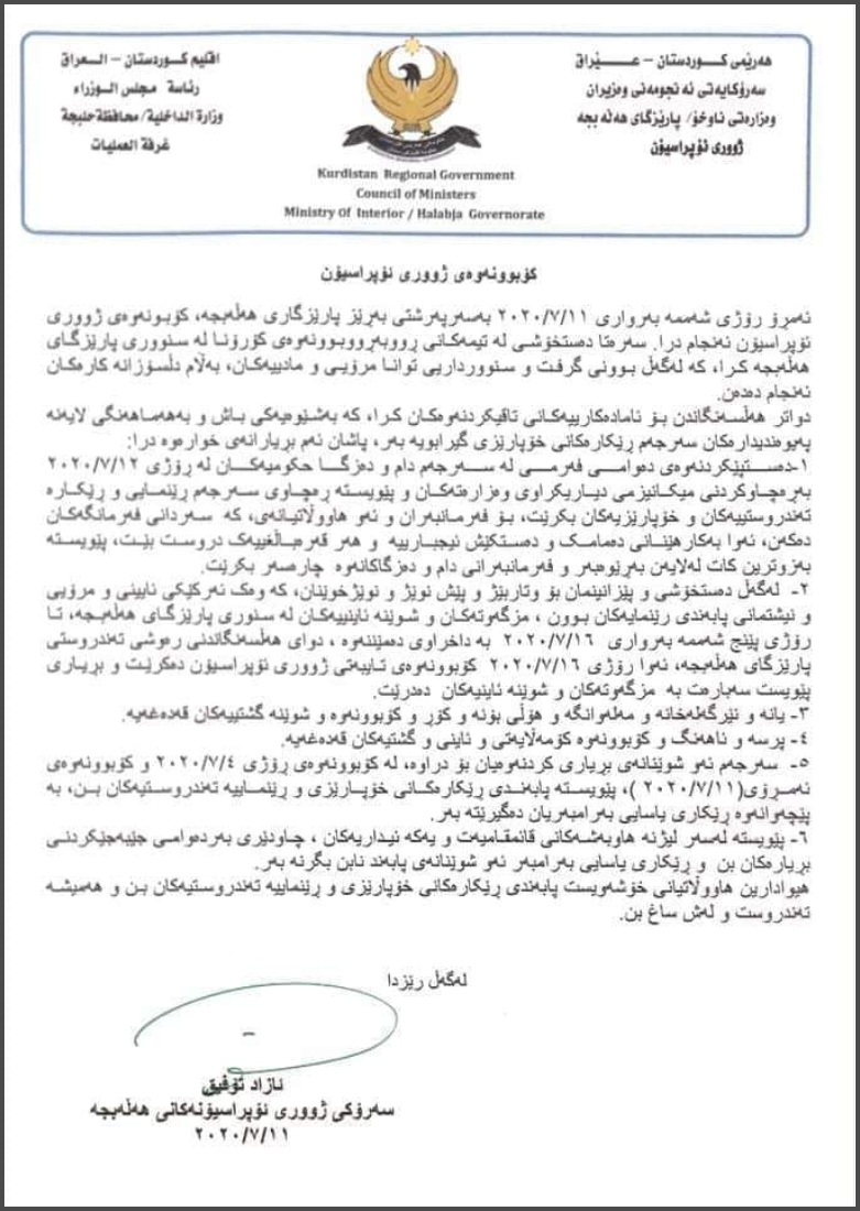 دوای هەڵسەنگاندنی دۆخەکە، بەپێی راگەیەندراوێکی سەرۆکی ژووری ئۆپەراسیۆنی هەڵەبجە، بڕیاردراوە: دەوام لە 12-7-2020 لە سەرجەم فەرمانگەکان دەستپێبکاتەوە و دەرگای مزگەوت و شوێنە ئایینییەکان تاوەکو 16-7-2020 بە داخراوی بمێننەوە.