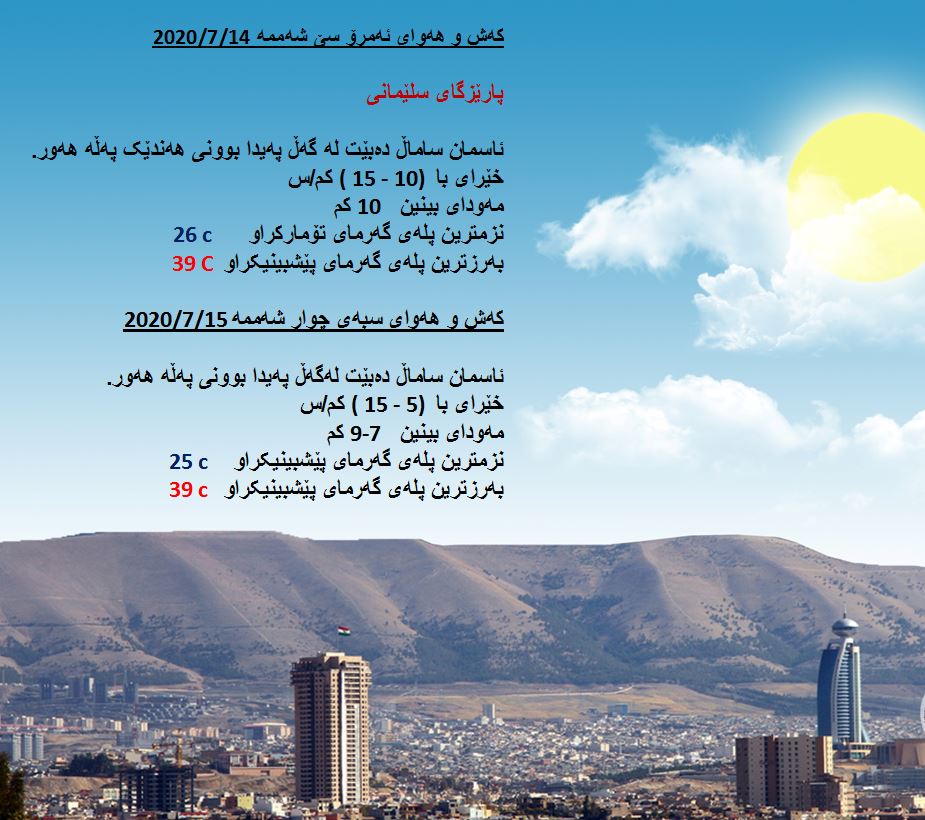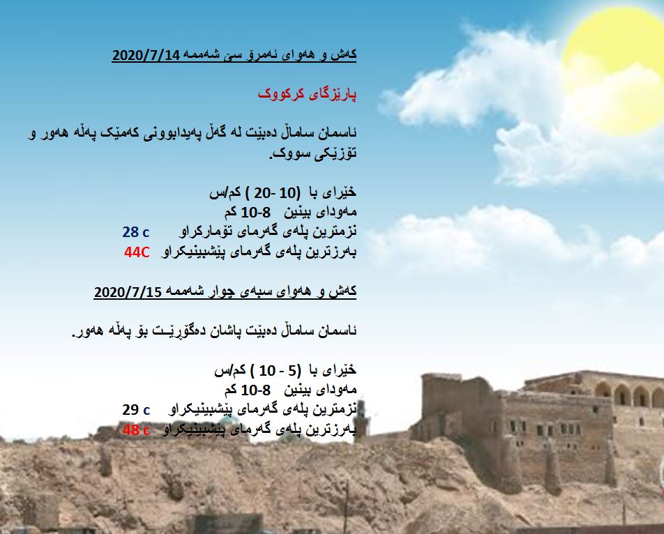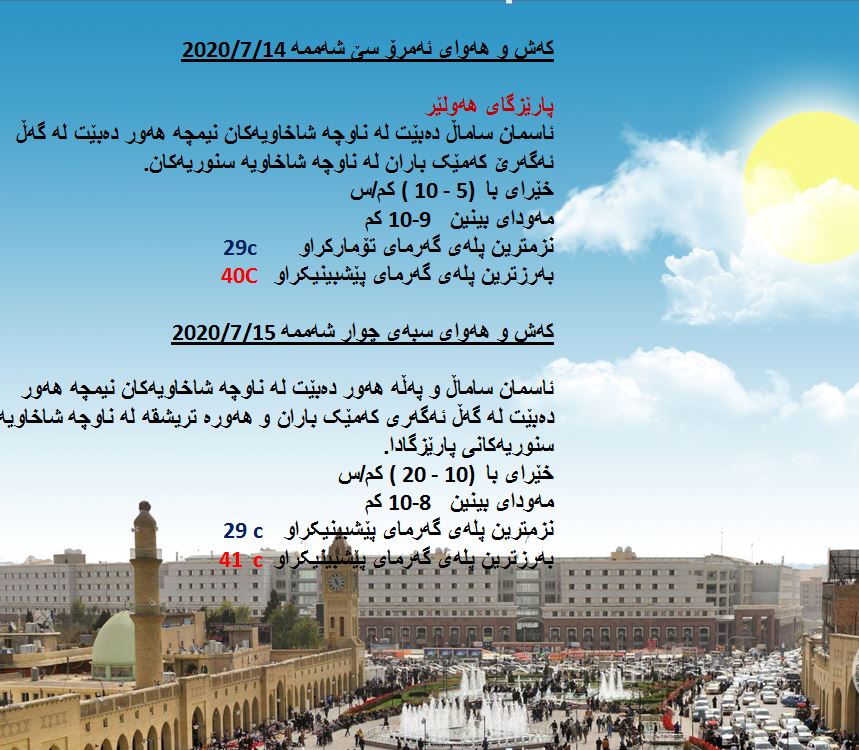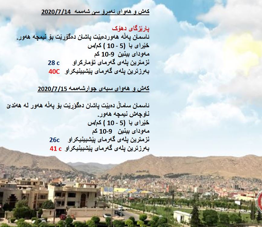 بەڕێوەبەرایەتی كەشناسی و بومەلەرزەزانی ھەرێمی كوردستان، پێشبینیەكانی بۆ 48 كاتژمێری كەشوھەوا راگەیاند، بەگوێرەی پێشبینیەكان ئەمڕۆ ئاسمان لەنێوان ساماڵ و نیمچە ھەوردا دەبێت، لە ھەندێك ناوچە ئەگەری كەمێك باران ھەیە. بەرزترین پلەی گەرما لە ھەولێر و دھۆك 40 و سلێمانی 39 و لە كەركووك 44 پلەی سیلیزی دەبێت.