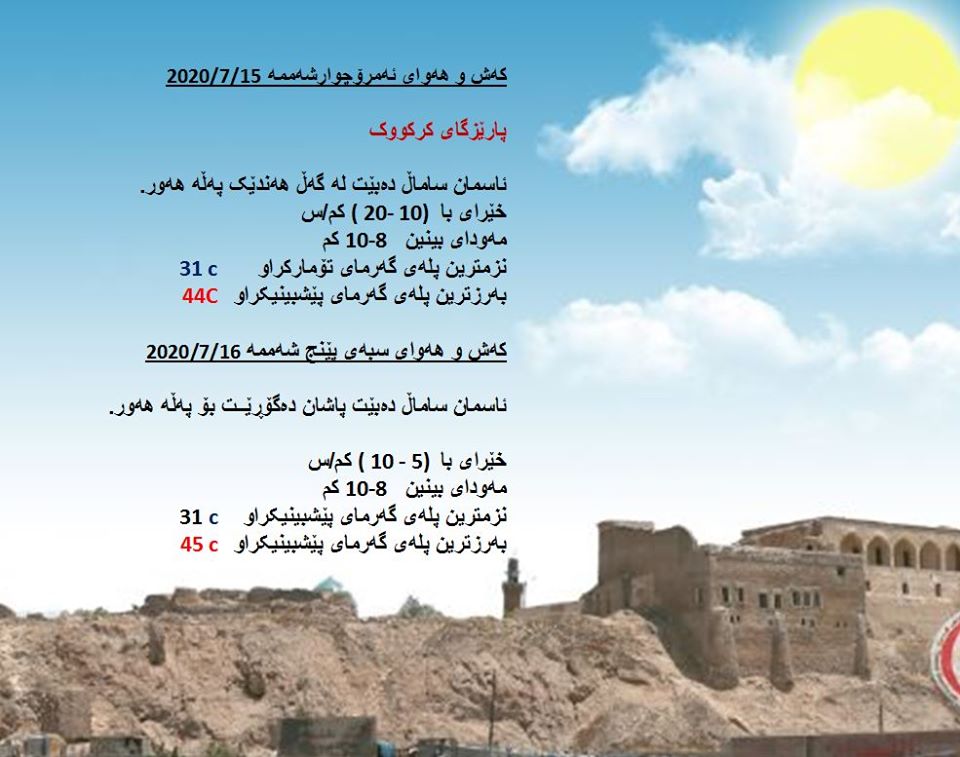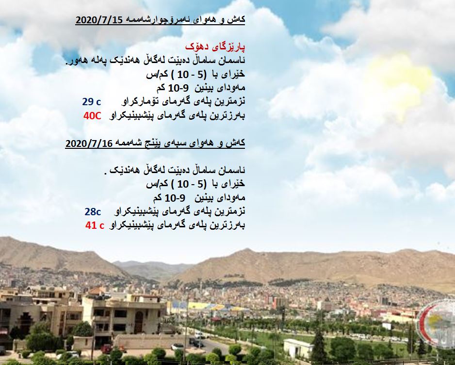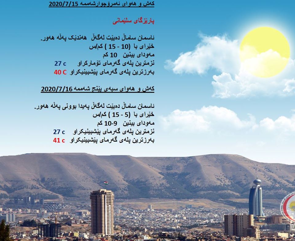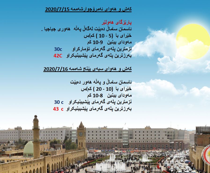 بەڕێوەبەرایەتی كەشناسی و بومەلەرزەزانی ھەرێمی كوردستان، پێشبینیەكانی بۆ 48 كاتژمێری كەشوھەوا راگەیاند، بەگوێرەی پێشبینیەكان ئەمڕۆ ئاسمان لەنێوان ساماڵ دەبێت لەگەڵ بوونی پەڵە ھەور. بەرزترین پلەی گەرما لە ھەولێر 42 و لە دھۆك و سلێمانی 40 و لە كەركووك 44 پلەی سیلیزی دەبێت.