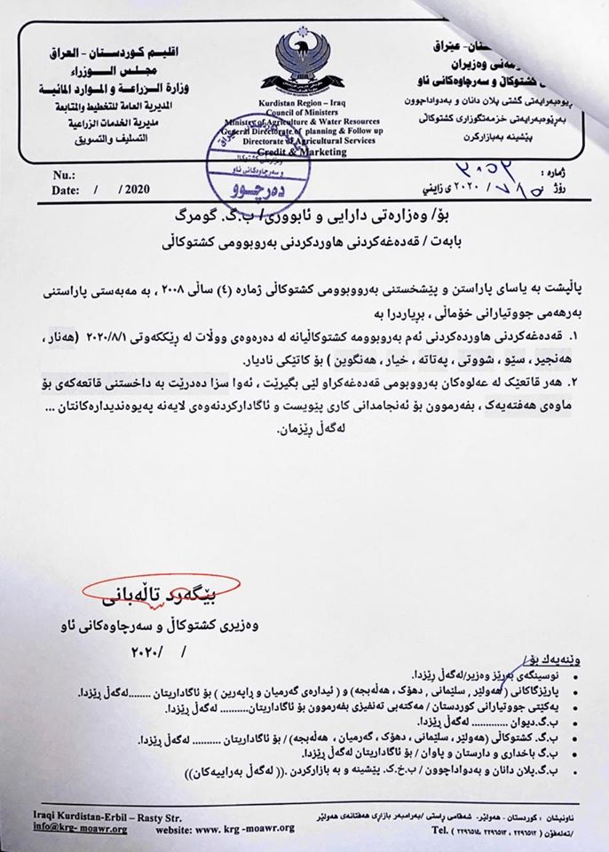 به‌ گوێره‌ی نووسراوێكی وه‌زاره‌تی كشتوكاڵ، به‌ مه‌به‌ستی پاراستنی به‌رهه‌می جووتیارانی ناوخۆ بڕیار دراوه‌، له‌ 1ی ئاب/ ئۆگستی 2020ه‌وه‌ هاورده‌كردنی ئه‌م به‌رهه‌مانه‌ قه‌ده‌غه‌ بكرێن، له‌وانه‌ (هه‌نار، هه‌نجیر، سێو، شووتی، په‌تاته‌، خیار، هه‌نگوین).