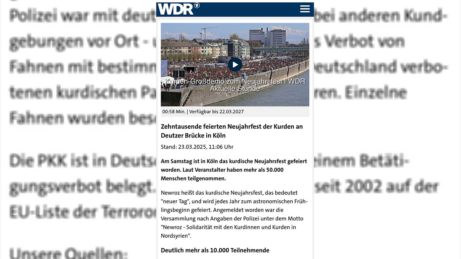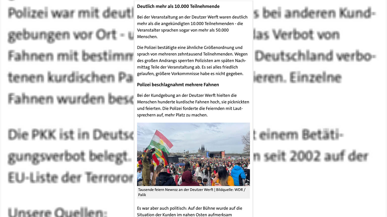 ئاهەنگە فراوانەکەی نەورۆز لە کۆڵن، بووەتە باسی میدیاکانی ئەڵمانیا و یەکێک لە دامەزراوە میدیاییەکان ڕایگەیاندووە، سەرەڕای ئەو بەشدارییە فراوانەی لە ئاهەنگی نەورۆز هەبوو، بەڵام هیچ ڕووداوێکی نەخوازراو ڕووینەدا.