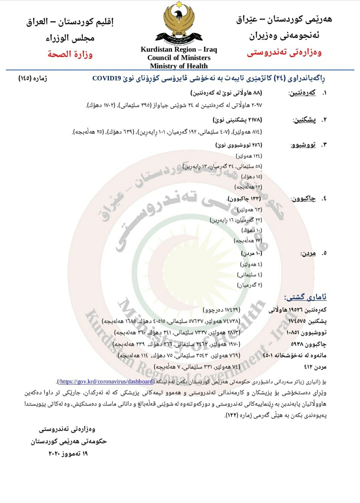 وهزارهتی تهندروستی حكومهتی ههرێمی كوردستان ئاماری 24 كاتژمێری رابردووی كۆرۆنای راگهیاند و بهگویرهی راگهیهندراوهكه له ماوهی شهو و رۆژێكدا 256 كهس تووشی ڤایرۆسی كۆرۆنا بوونه و 10 كهسی دیكهش گیانیان لهدهستداوه.