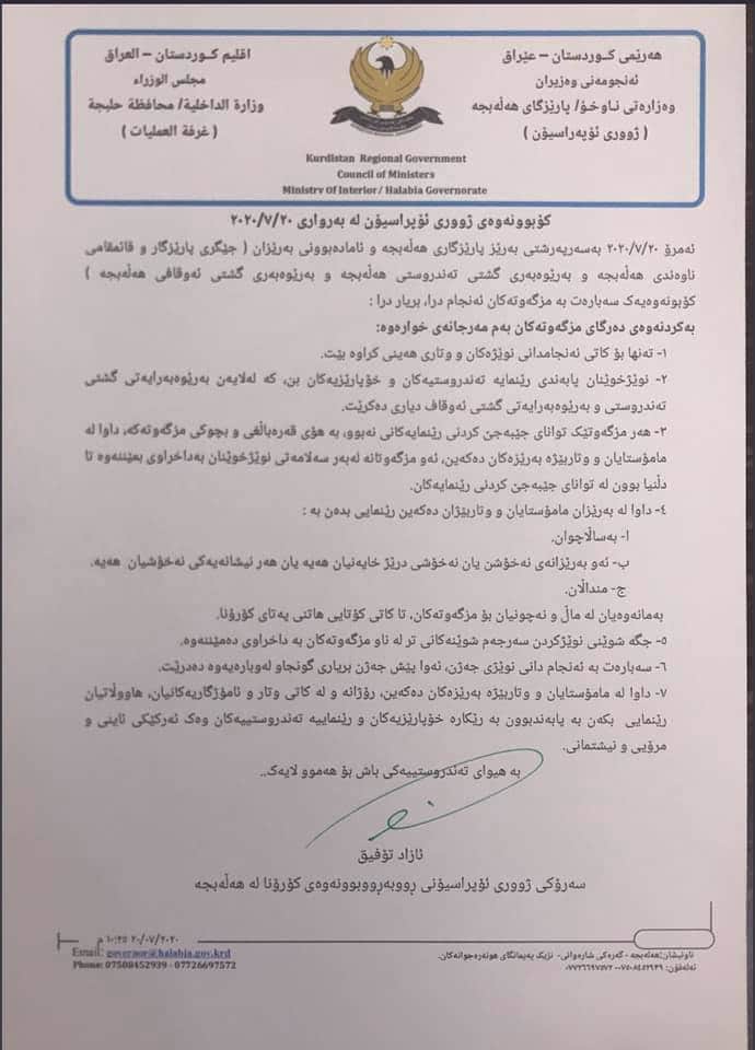 بەگوێرەی راگەیەندراوی ژووری ئۆپەراسیۆنی ھەڵەبجە، بڕیاردراوە مزگەوتەكان تەنھا بۆ كاتی ئەنجامدانی نوێژەكان و وتاری رۆژی ھەینی كراوەبن. ھەروەھا نوێژخوێنان پابەندی رێنماییە تەندروستییەكان و خۆپارێزی بن.