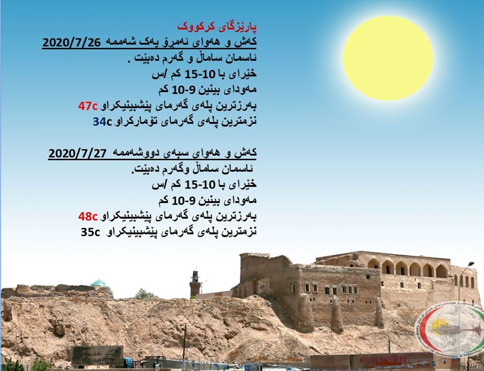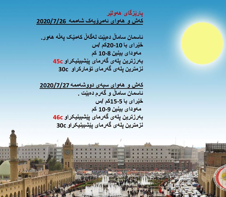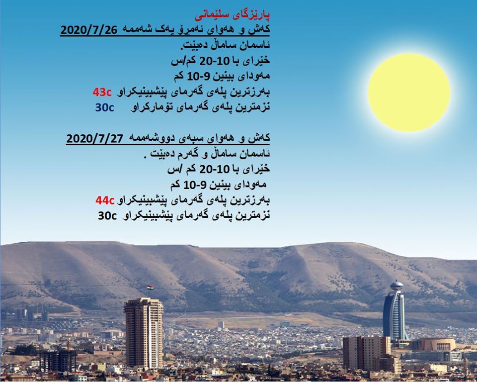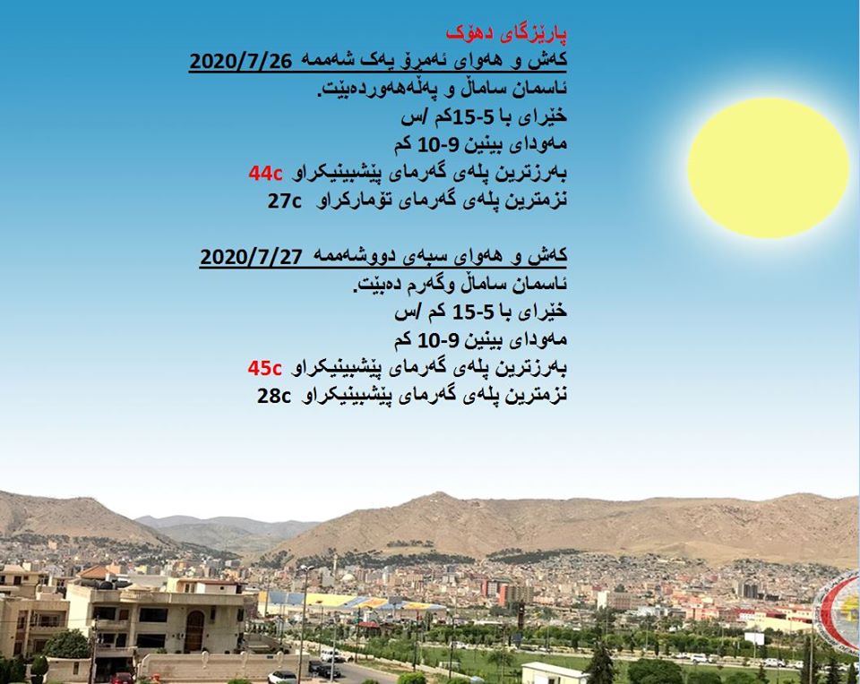 بەڕێوەبەرایەتی كەشناسی و بومەلەرزەزانی ھەرێمی كوردستان، پێشبینیەكانی بۆ 48 كاتژمێری كەشوھەوا راگەیاند، بەگوێرەی پێشبینیەكان ئەمڕۆ ئاسمان ساماڵ دەبێت. بەرزترین پلەی گەرما لە ھەولێر 45 و سلێمانی 43 و دھۆك 44 لە كەركووك 47 پلەی سیلیزی دەبێت.