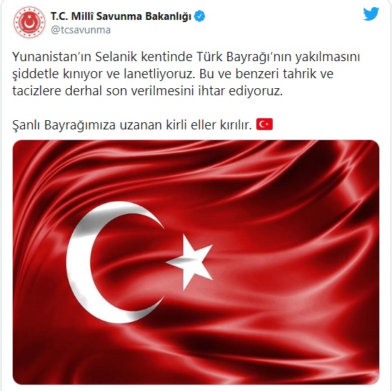 دوای ئەوەی لە ئەنجامی هەڵچوونی گرژییەكانی نێوان توركیا و یۆنان ژمارەیەك چالاكوانی یۆنانی لە شاری سالۆنیكی وڵاتەكەیان ئاگریان لە ئاڵای توركیا بەردا، وەزارەتی بەرگری توركیا لە تویتێكدا لە هەژماری تایبەتی خۆی لە تۆڕی كۆمەڵایەتی تویتەر رەخنەی توندی ئاراستەی یۆنان كرد و داوای لە ئەسینا كرد، "دەستبەجێ سنوورێك بۆ ئەو گێچەڵكاریانە دانێت".