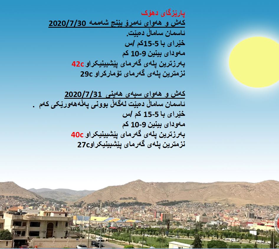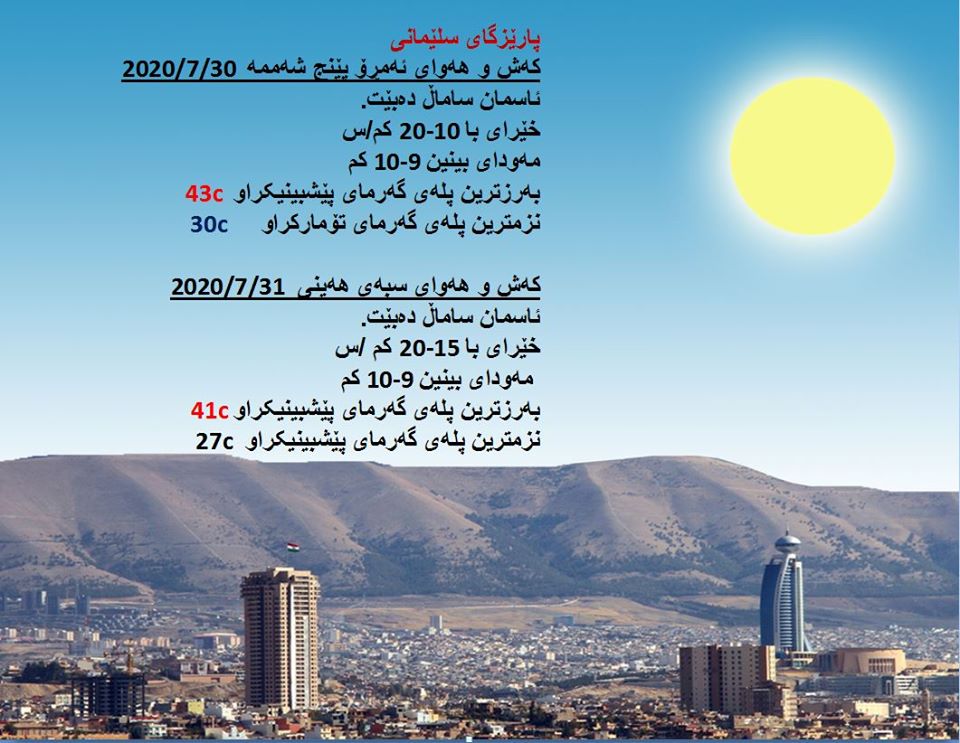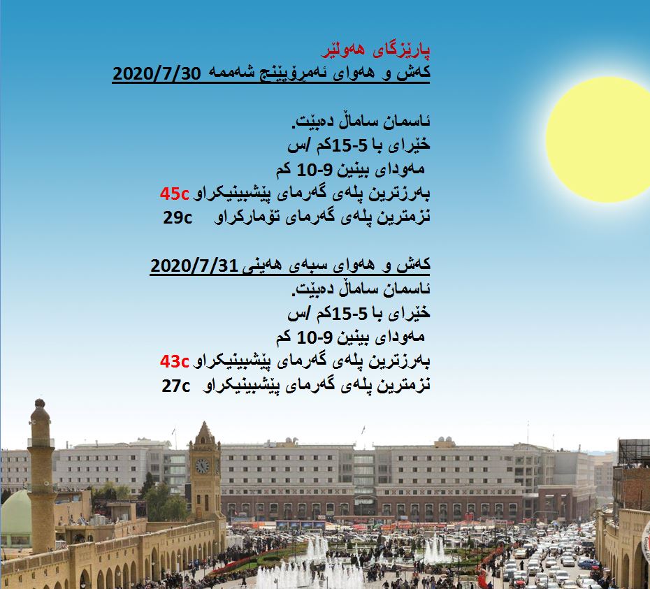 بەڕێوەبەرایەتی كەشناسی و بومەلەرزەزانی ھەرێمی كوردستان، پێشبینیەكانی بۆ 48 كاتژمێری كەشوھەوا راگەیاند، بەگوێرەی پێشبینیەكان ئەمڕۆ ئاسمان ساماڵ دەبێت. بەرزترین پلەی گەرما لە ھەولێر 45 و سلێمانی 43 و دھۆك 42 لە كەركووك 47 پلەی سیلیزی دەبێت.