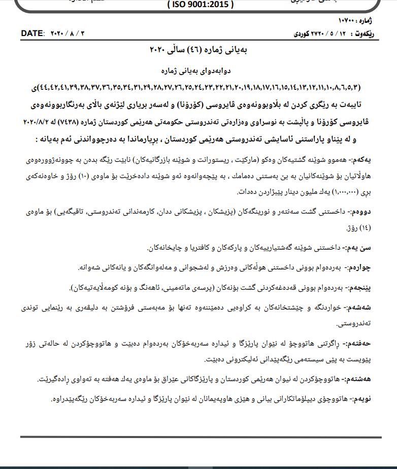 ههشتهم: هاتوچۆی نێوان ههرێم و عێراق بۆ ماوهی ههفتهیهك رادهگیرێت.