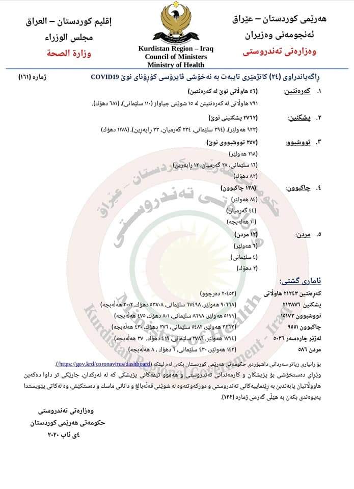 دەقی راگەیەندراوی ژمارە 161ـی وەزارەتی تەندروستی: