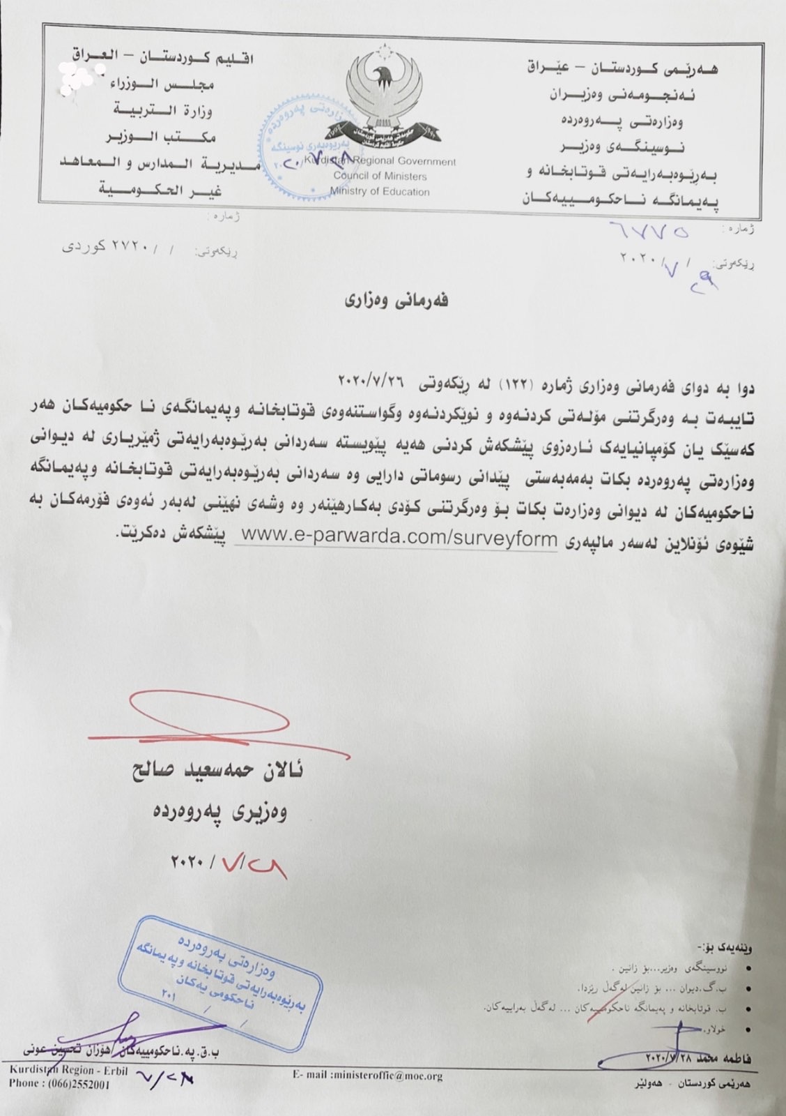 لە فەرمانێكی وەزاریدا، كە واژووی ئالان حەمەسەعید، وەزیری پەروەردەی بەسەرەوەیە، وەزارەتی پەروەردە لەبارەی پێدانی مۆڵەت و گواستنەوەی خوێندنگەكان ئارەزوومەندان ئاگادار دەكاتەوە، هەر كەسێك خوازیارە دەتوانێت سەردانی بەڕێوبەرایەتی ژمێریاری لە دیوانی وەزارەتی پەروەردە بكات.