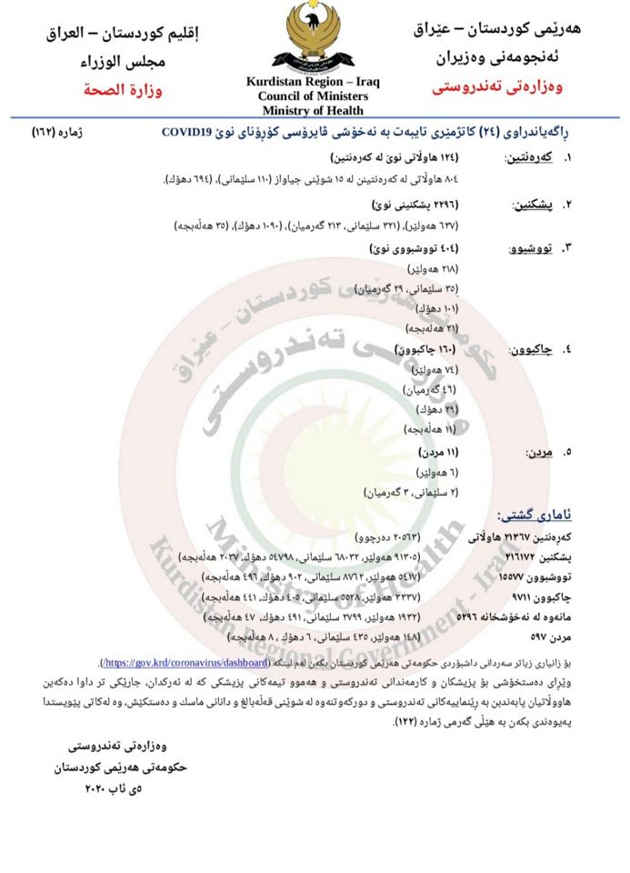 وهزارهتی تهندرووستی حكومهتی ههرێمی كوردستان، ئهمڕۆ چوارشهممه راگهیهندراوی ژماره 162ی رۆژانهی خۆی سهبارهت به نوێترین ئاماری پهیوهست به پهتای كۆرۆنا له ههرێمی كوردستان بڵاوكردهوه. به گوێرهی ئامارهكه، 11 كهسی دیكه گیانیان لهدهستداوه و 404 كهسی دیكهش تووشی كۆرۆنا بوون، كه زۆربهیان له ههولێر و دهۆكن.