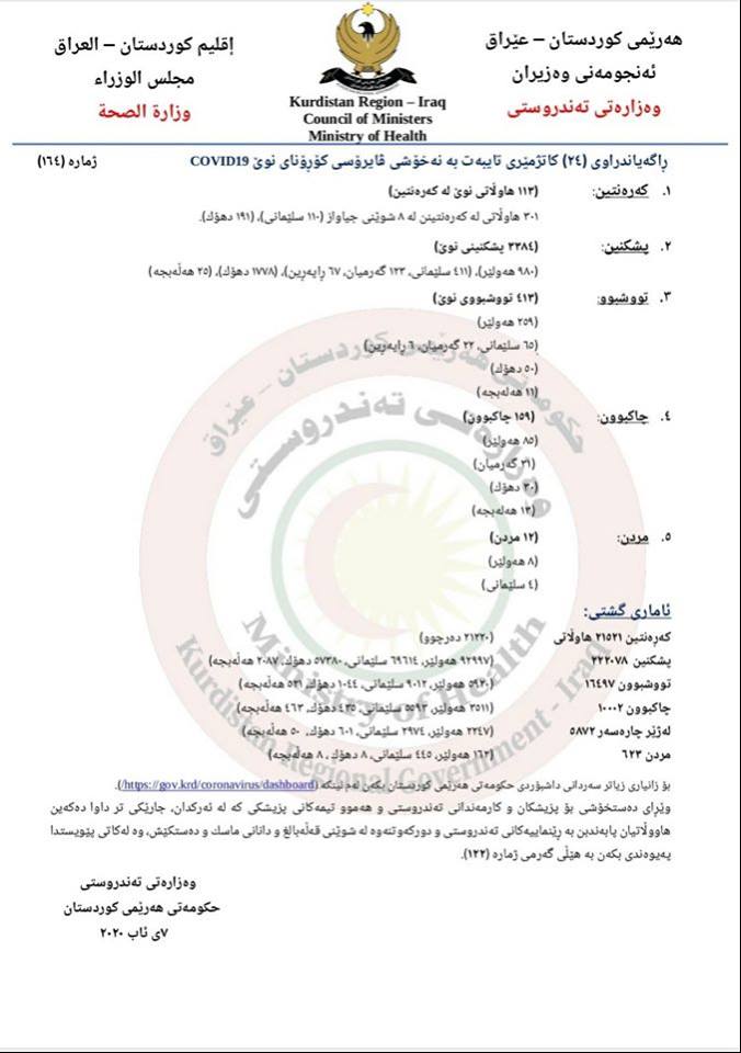 وه‌زاره‌تی ته‌ندروستی حكومه‌تی هه‌رێمی كوردستان له‌ راگه‌یه‌ندراوێكدا ئاماری 24 كاتژمێری رابردووی كۆرۆنای راگه‌یاند، به‌گویره‌ی راگه‌یه‌ندراوه‌كه‌ له‌ ماوه‌ی شه‌و و رۆژێكدا 413 كه‌س تووشی ڤایرۆسی كۆرۆنا بوونه‌ و 12 كه‌سی دیكه‌ش به‌هۆی په‌تاكه‌ گیانیان له‌ده‌ستداوه‌.