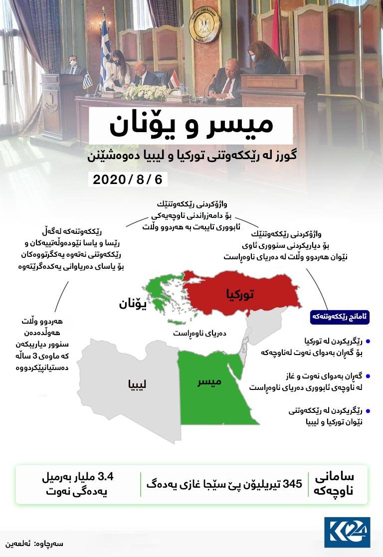 میسر و یۆنان رۆژی پێنجشەممە (6-8-2020) رێککەوتنەکەیان لەبارەی دیاریکردنی سنووری دەریایی هەردوولا واژۆکرد، کە ناوچە ئاوییە ئابوورییەکانی هەردوولایان لە دەریای ناوەڕاست لەخۆدەگرێت.