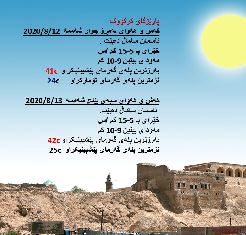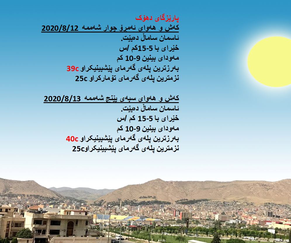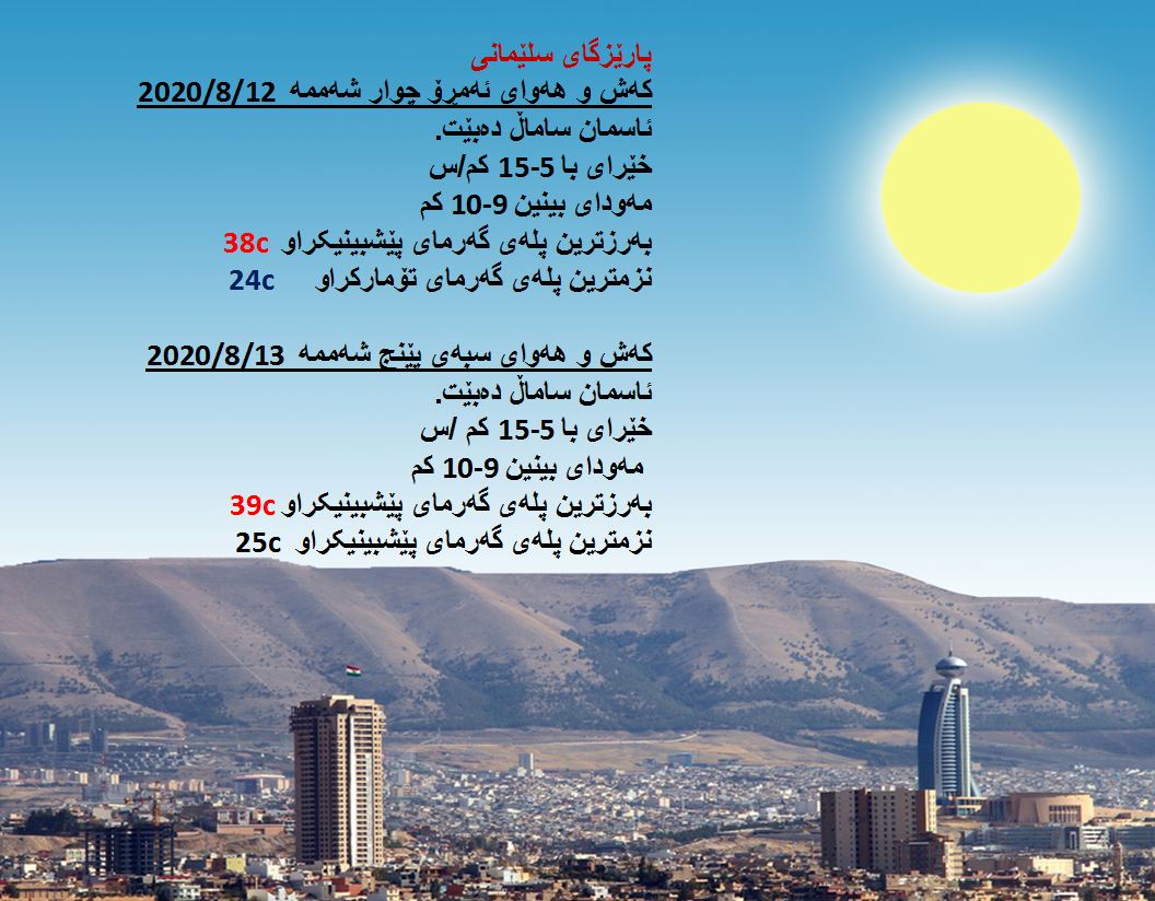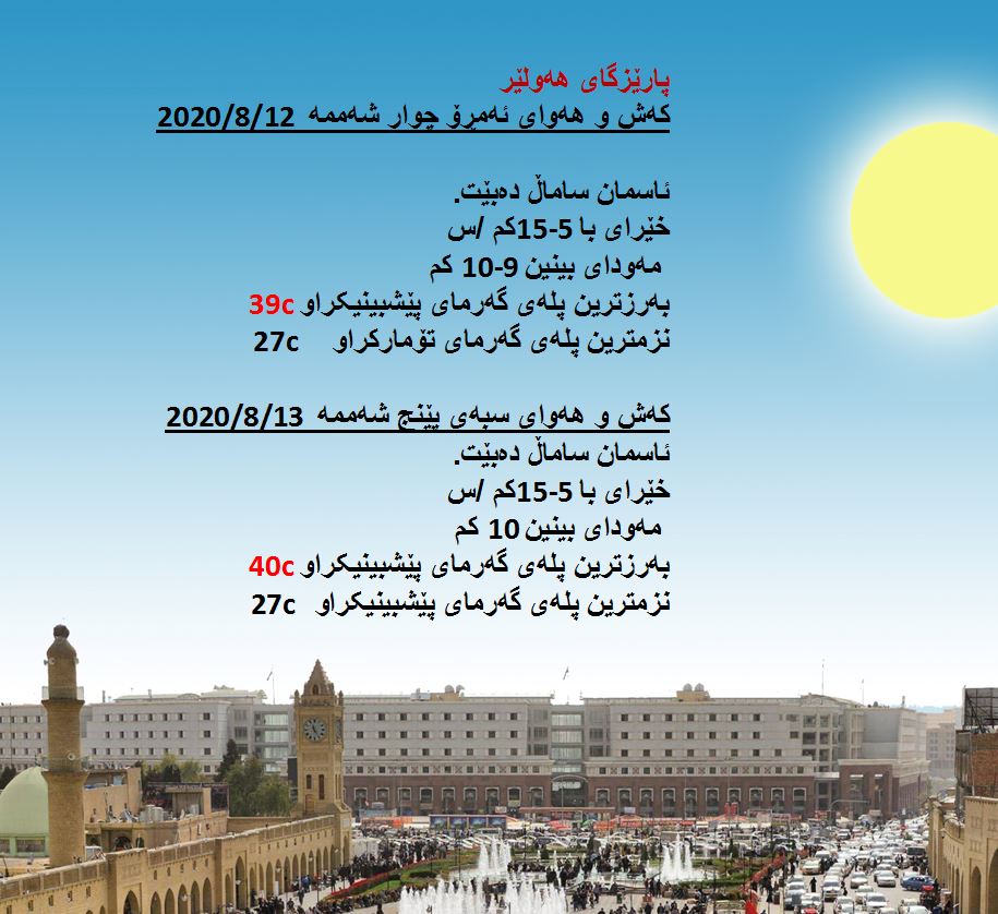بەڕێوەبەرایەتی كەشناسی و بومەلەرزەزانی ھەرێمی كوردستان، پێشبینیەكانی بۆ 48 كاتژمێری كەشوھەوا راگەیاند، بەگوێرەی پێشبینیەكان ئەمڕۆ ئاسمان ساماڵ دەبێت. بەرزترین پلەی گەرما لە ھەولێر و دھۆك 39 و سلێمانی 38 و لە كەركووك 41 پلەی سیلیزی دەبێت.