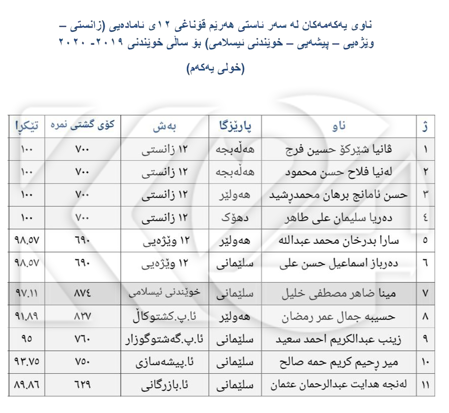 ناوی یهكهمهكانی سهر ئاستی ههرێمی كوردستان: