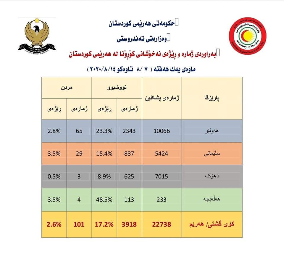 وهزارهتی تهندرووستی حكومهتی ههرێمی كوردستان له خشتهیهكدا ههڵكشانی ئاماری مردن و تووشبوون به كۆرۆنای له ماوهی یهك ههفتهدا و له 7ی ئاب تا 14ی ئابی بڵاوكردهوه.