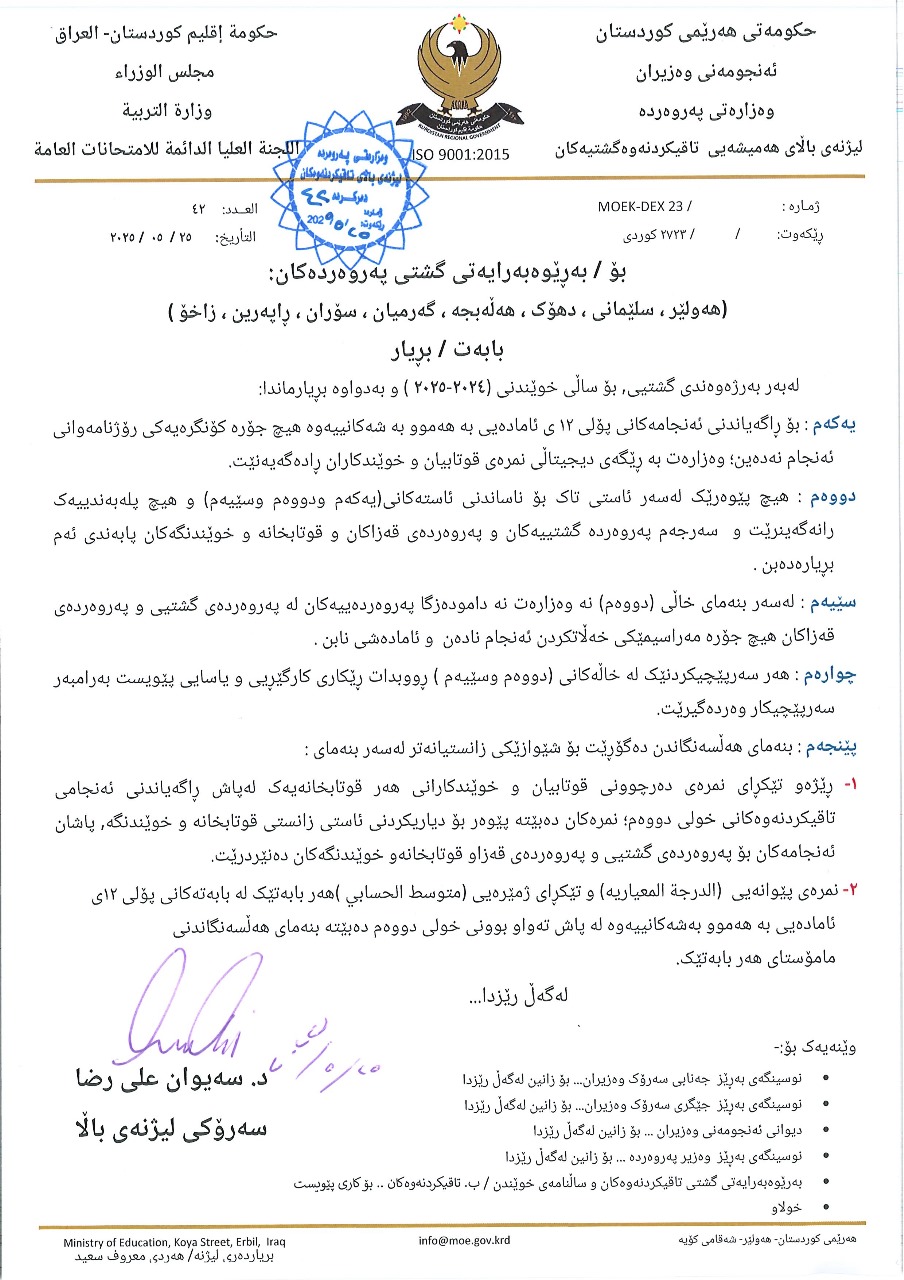 یەکشەممە، 25ـی ئایاری 2025، لیژنەی باڵای هەمیشەیی تاقیکردنەوە گشتییەکان لە وەزارەتی پەروەردە لە نووسراوێکدا ڕایگەیاند، لەبەر بەرژەوەندیی گشتیی بڕیارمان دا بۆ ڕاگەیاندنی ئەنجامەکانی پۆلی 12ـی ئامادەیی بەهەموو بەشەکانیەوە، هیچ جۆرە کۆنگرەیەکی ڕۆژنامەوانی نەکرێت. بەڵکو نمرەی قوتابیان بەڕێگەی ئەلیکترۆنی ڕادەگەیەندرێت.