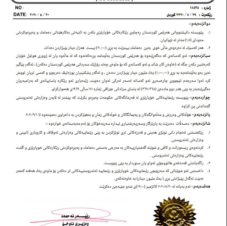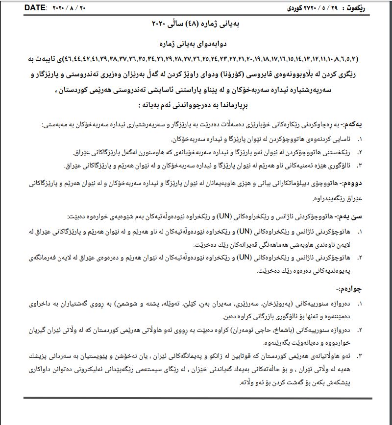 وه‌زاره‌تی ناوخۆی حكومه‌تی هه‌رێمی كوردستان له‌ باره‌ی رێكاره‌ نوێیه‌كانی خۆپارێزی و ئاسانكاری بۆ هاتوچۆ و كاركردنی هاووڵاتیان ئه‌م به‌یانه‌ی ده‌ركرد.