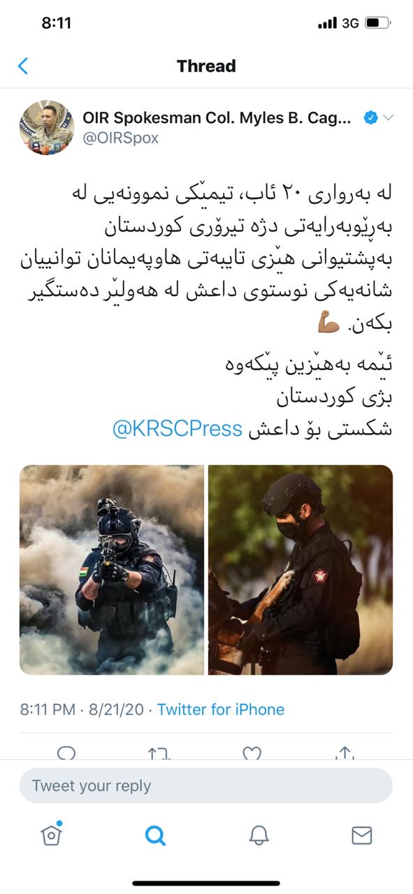 له راگهیهندراوهكهدا كه له ههژماری تایبهتی خۆی له تۆڕی كۆمهڵایهتی تویتهر بڵاویكردووهتهوه، گوتهبێژی هێزی هاوپهیمانان بڵاوكراوهتهوه، كاگینز نووسیویهتی، "ئێمه بههێزین پێكهوه، بژی كوردستان شكست بۆ داعش".