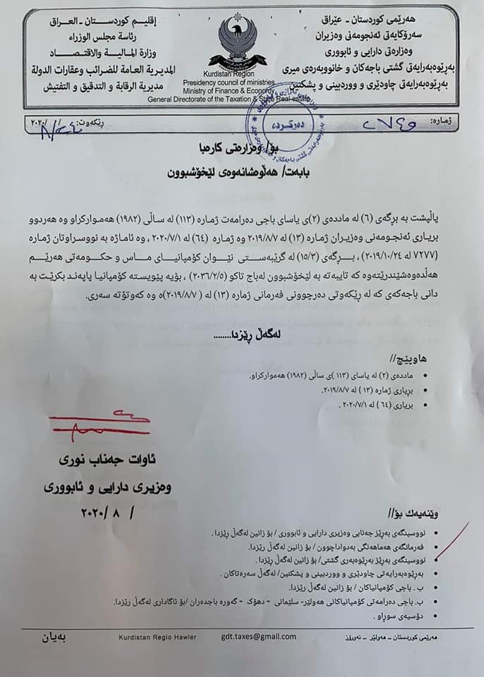 ھەر بەپێی نووسراوی وەزارەتی دارایی، گرێبەستی نێوان حکومەتی هەرێم و کۆمپانیای ماس هەڵدەوەشێندرێتەەوە کە تایبەتە بەلێخۆشبوون لە باج تاکو ٥/٢/٢٠٣٦، بۆیە پێویستە کۆمپانیای ماس پابەند بکرێت بە دانی باجەکەی لە رێکەوتی دەرچونی فەرمانی ژمارە (١٣) لە ٧/٨/٢٠١٩.