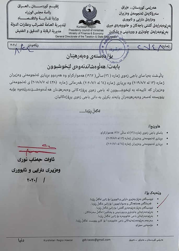 ئاوات شێخ جەناب، وەزیری دارایی وئابوری حکومەتی هەرێمی کوردستان، واژۆی لەسەر چەند بڕیارێكی تایبەت بە چاکسازی لە سیستمی باج كرد.