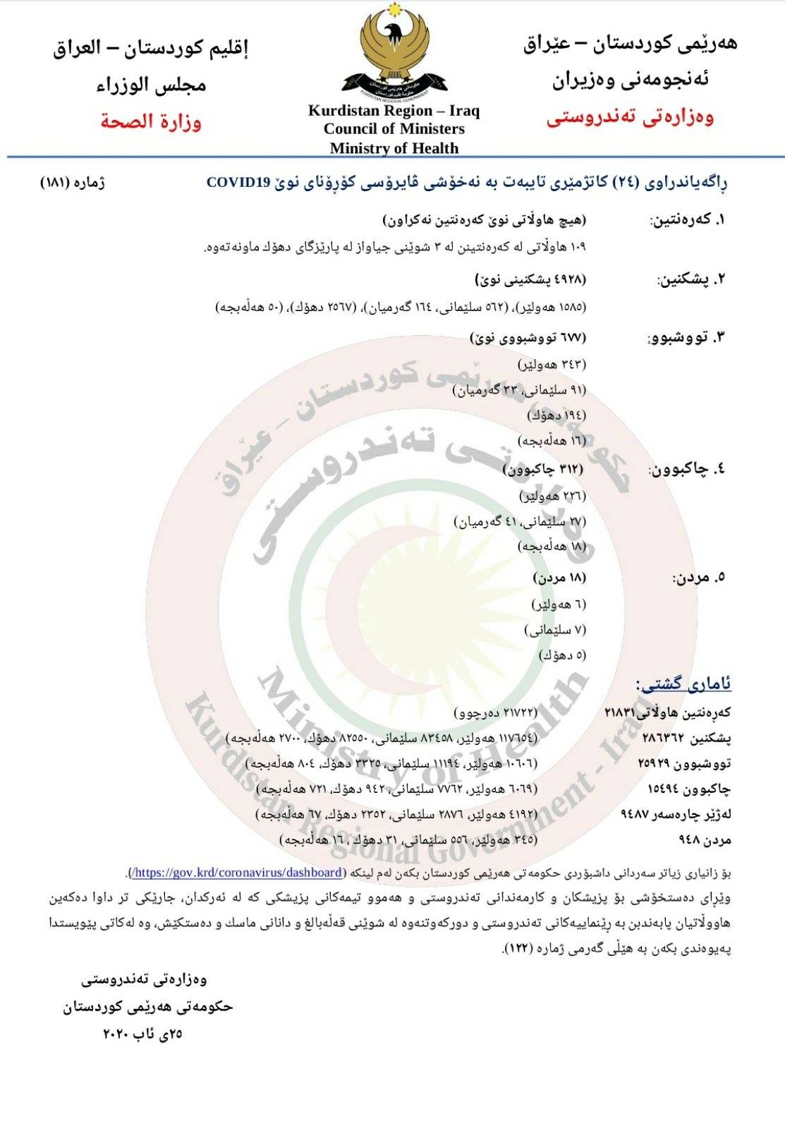 بەپێی راگەیەندراوی ژمارە 181ـی تایبەت بە کۆرۆنا لە هەرێمی کوردستان، تائێستا: 948 کەس بە کۆرۆنا گیانیان لەدەستداوە، 25 هەزار و 929 کەس تووشی کۆرۆنا بوون، لەبەرامبەردا 15 هەزار و 494 کەس چاکبوونەتەوە.