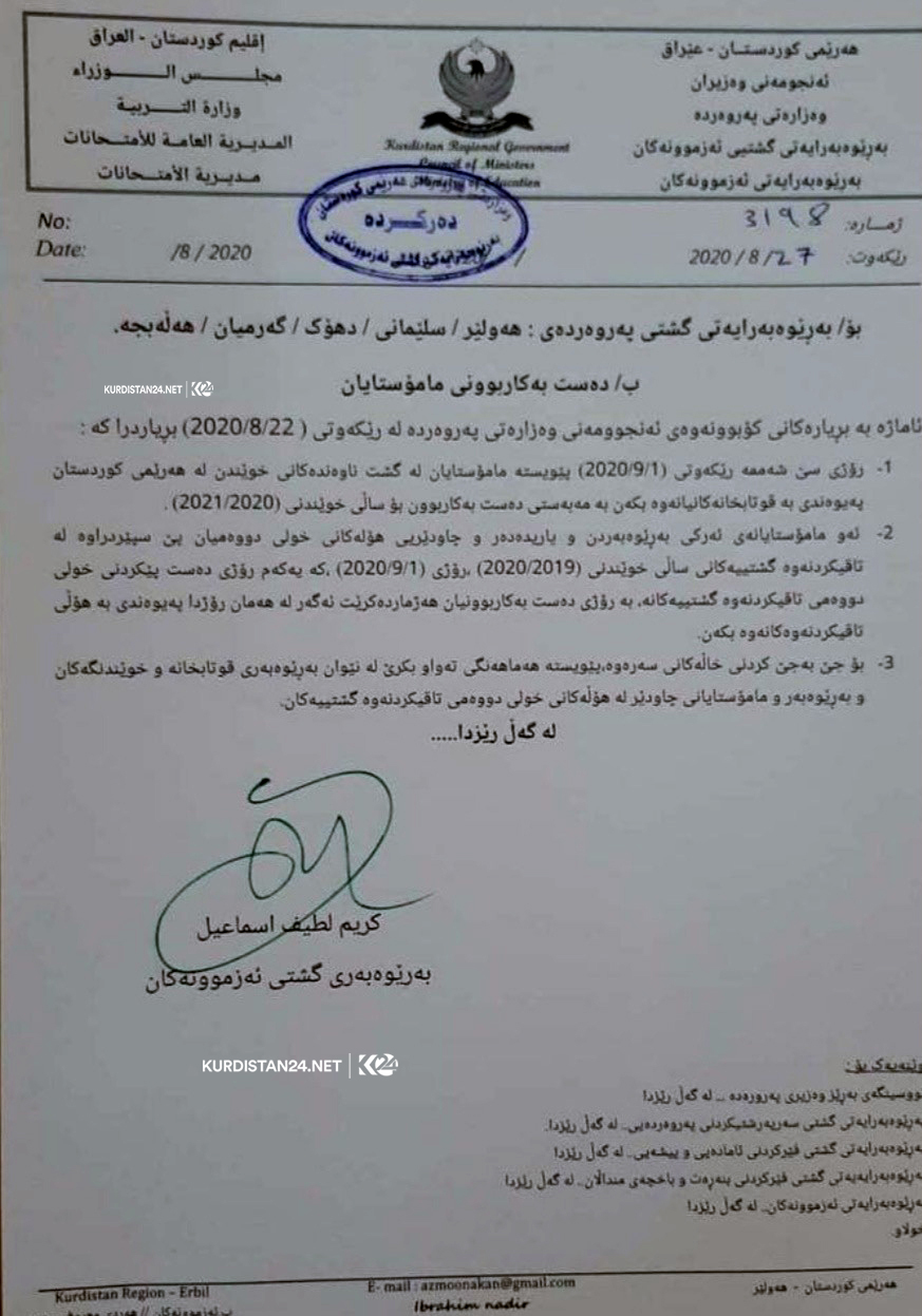 بەگوێرەی نووسراوێكی فەرمی بەڕێوەبەرایەتی گشتی ئەزمونەكانی وەزارەتی پەروەردە كە ئاراستەی بەڕێوەبەرایەتیە گشتییەكان كراوە و وێنەیەكی دەست كوردستان24 كەوتووە و تێیدا ھاتووە، رۆژی سێشەممە 1/9/2020 پێویستە مامۆستایان لە گشت ناوەندەكانی خوێندن پەیوەندی بە قوتابخانەكانیانەوە بكەن بە مەبەستی دەستبەكاربوون بۆ خوێندنی ساڵی 2020- 2021.