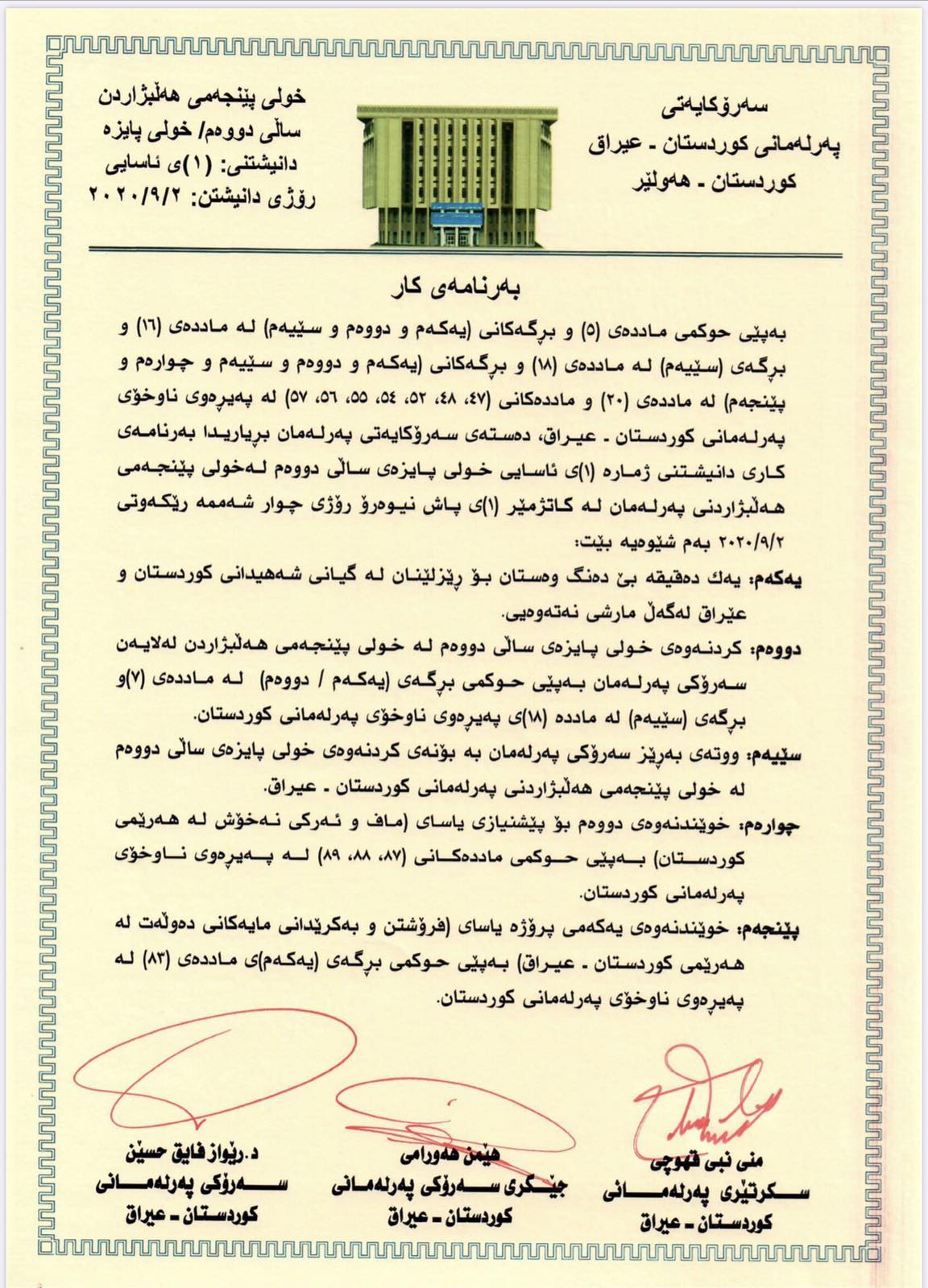 رۆژی چوارشممە خوولی پایزەی پەرلەمان دەستپێدەکات، بۆ ئەو مەبەستەش سەرۆکی پەرلەمان داوا دەکات گشت پەرلەمانتاران ئامادەبن بۆ تاوتوێکردنی دوو بابەت.