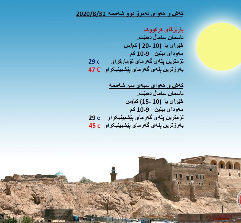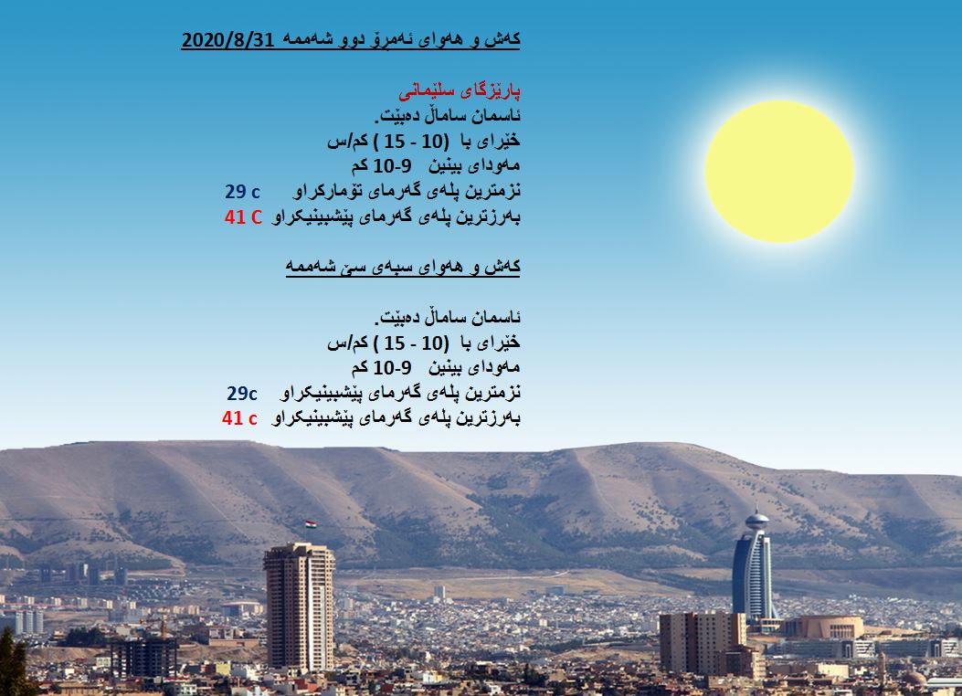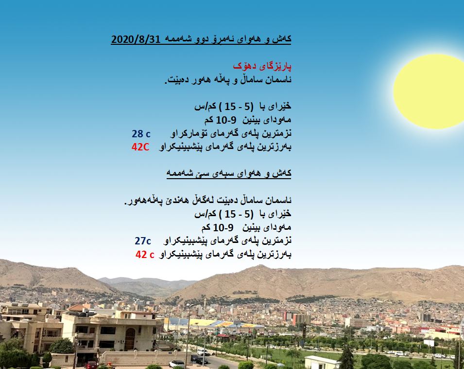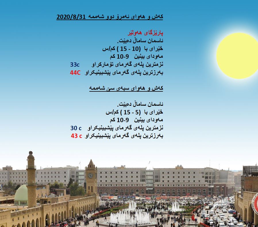 بەپێی داتاکانی بەڕێوەبەرایەتی گشتیی کەشناسی و بوومەلەرزەزانیی هەرێمی کوردستان، بەرزترین پلەی گەرما ئەمڕۆ (دووشەممە 31-8-2020) لە هەولێر، 44 پلەی سیلیزی دەبێت و نزمترین پلەی گەرماشی دەگاتە 33 پلە.