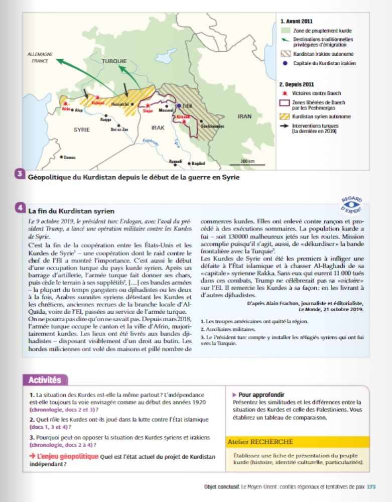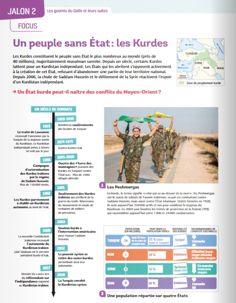 لە کتیبی مێژوو و جوگرافیای پۆلی 12ـی ئامادەیی فەرەنسا، بۆ ئەمساڵی خوێندن (2020-2021) بەشێک تەرخانکراوە بۆ باسکردنی مێژووی کورد و کوردستان و پێشمەرگە.